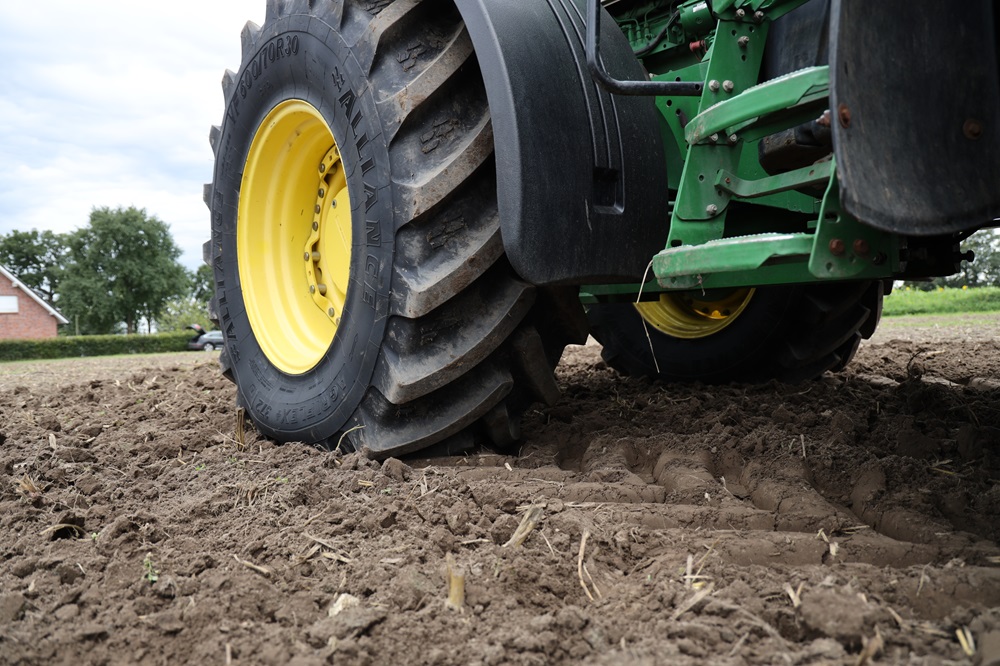 VF-banden van Alliance worden nu op de boerderij gebruikt voor gewasverzorging, kunstmeststrooien, wieden en eggen, maar vooral voor het verspreiden van mest. Voor de boer is één ding bijzonder belangrijk: “Intussen hebben wij onze mengmesttank ook uitgerust met een VF-band, de Agriflex+ 389 VF, eveneens met bandenspanningscontrolesysteem. We beseften al snel dat de zachtste banden van de trekker weinig nut hebben als de volgende mengmesttank is uitgerust met gewone banden die de positieve effecten van de trekkerbanden tenietdoen. De doorbuiging van de banden en het daaruit voortvloeiende grotere contactoppervlak bij een lagere bandenspanning zien wij als een enorm voordeel. In het zeer natte jaar 2023 konden we nog steeds mest verspreiden over natte weilanden zonder bandensporen achter te laten. Dat zou zonder deze technologie – dus met de oude banden – gewoon niet mogelijk zijn geweest!”