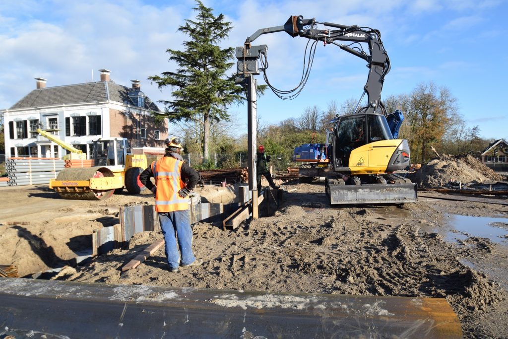 De veelzijdige werktuigdrager kon zich na de officiële overdracht in november direct bewijzen op het nieuwbouwproject Vechtvoorde in Breukelen. Daar verrijst een mix van villa’s, pakhuizen, lofts en penthouses. Om het geheel nog meer allure te geven, wordt er via een aftakking van rivier De Vecht een gracht met aanlegsteigers gecreëerd. Voor de realisatie van deze waterarm is CivielTech gevraagd om circa honderdveertig meter beschoeiing aan te leggen met behulp van 5,5 meter lange stalen damwanden. Een kolfje naar de hand van de Mecalac 15MC, die hiervoor is uitgerust met een ICE trilblok met 395 kN slagkracht.