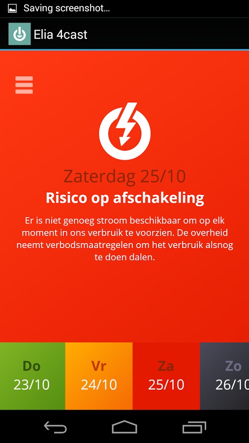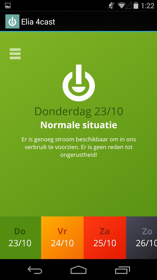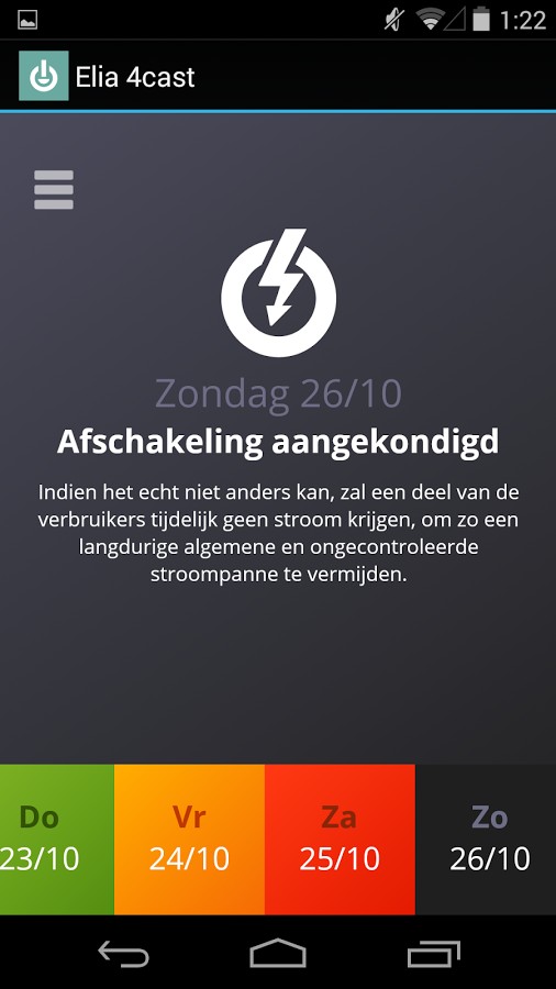 Via een kleurencode (groen, oranje, rood en zwart) en specifieke symbolen kun je steeds onmiddellijk zien of de situatie op het elektriciteitsnet de komende 7 dagen normaal is, er een risico op stroomtekort is, een risico op afschakeling of er een afschakeling voorzien is. Hiermee is deze nieuwe app feitelijk de smartphone variant van www.winterklaar.be. De app wordt automatisch geüpdatet met de meeste recente vooruitzichten van Elia en je krijgt informatie van de dag zelf en de volgende zes dagen. Via pushberichten wordt je direct geïnformeerd als er een risico is op stroomtekort of op afschakeling en bij een geplande afschakeling. Een wijziging in de vooruitzichten voor de volgende dagen is eveneens goed voor een pushbericht.