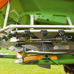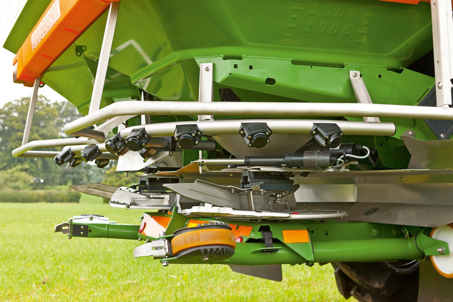 Voor wie wil, is er de mogelijkheid om de kantstrooischoepen elektrisch te activeren. Dit gebeurt via een actuator aan de onderzijde van het frame die twee korte aanvoerschoepen direct naast het midden van de strooischijven verstelt.
