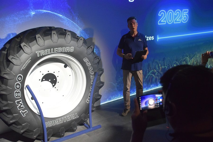 ProgressiveTraction is al even gekend in de markt, het hoogtepunt van de presentatie werd daarom de lancering van een totaal nieuw product. Met een indrukwekkend optreden presenteerde Trelleborg de TM800 VF PFO (Pressure Field Operation), oftewel de TM800 PowerFlex. “Dit nieuw ontwikkeld profiel is gericht op tractoren met een gemiddeld tot hoog vermogen”, aldus Bucci. “Het is ook een band die gebruik maakt van de ProgressiveTraction-technologie, waardoor grip, tractie, zelfreiniging en brandstofefficiëntie toenemen terwijl slip en slijtage verminderen. De toevoeging van een centrale rib, geïnspireerd op de geometrie van wegbanden, zorgt voor meer stabiliteit, stuurprecisie en rijcomfort tijdens transport. De rolweerstand is laag. Het resultaat is een erg efficiënte band die uitzonderlijk presteert onder alle werkomstandigheden, van veld tot weg.”