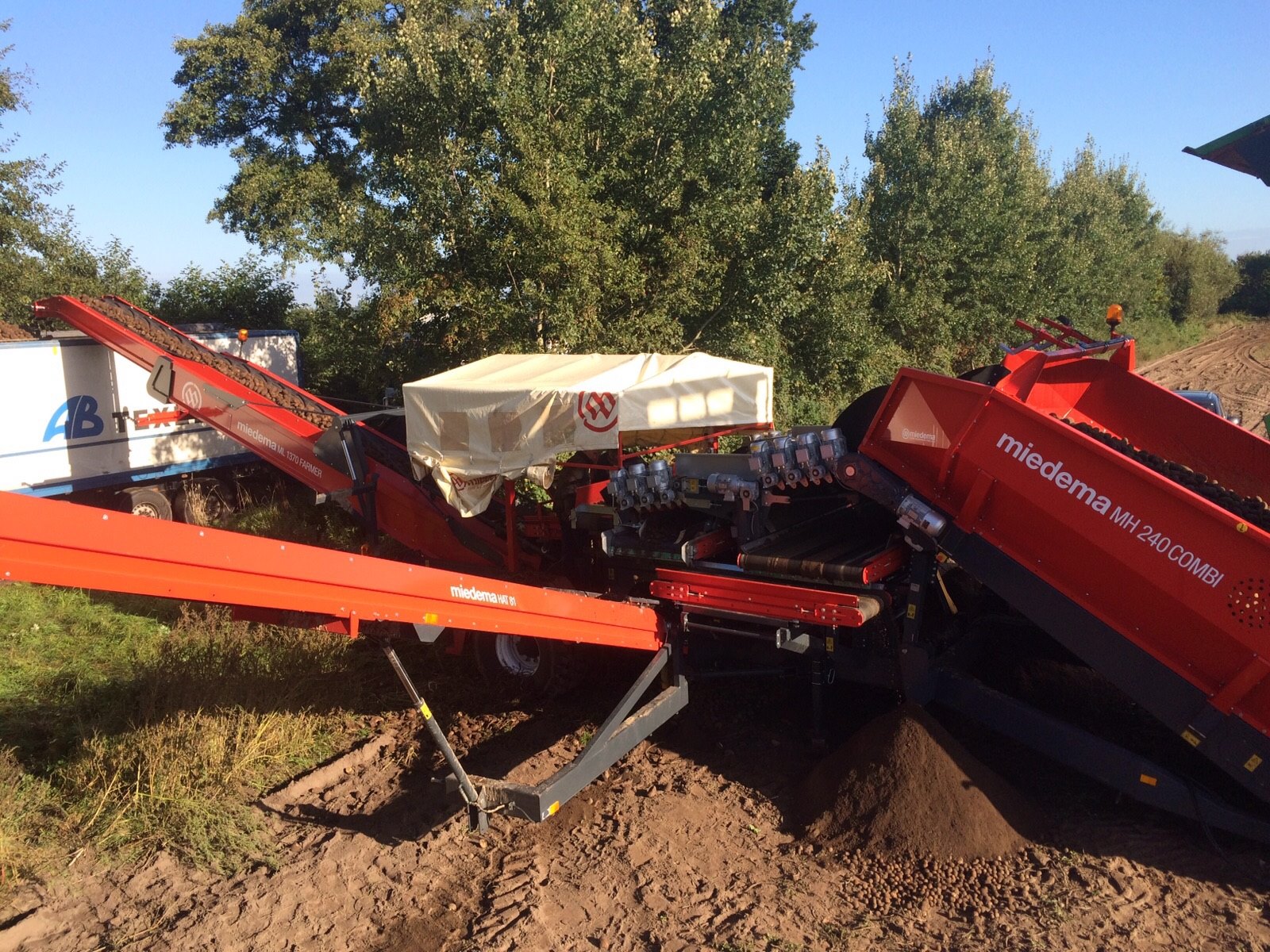 De Miedema MHC 240 combi is een ‘custom made’ machine en beschikt over een bodemmat van 460 cm lengte, twee rollenunits waar de uitgezeefde grond zijdelings wordt afgevoerd en waar ook de ondermaat uit gesorteerd wordt en zijdelings afgevoerd via een lange opzij zwenkende opvoerband. De overmaat aardappelen komen op een leestafel waarna ze door 2 tot 4 personen worden nagekeken op kluiten, rot, loof e.d. Vervolgens worden ze met een telescopische hallenvuller op een vrachtwagen gedraaid. De machine is ook geschikt voor loonwerkers die voor groepen aardappeltelers het rooien, sorteren, inschuren en vervoeren naar de fabriek uit handen kan nemen.