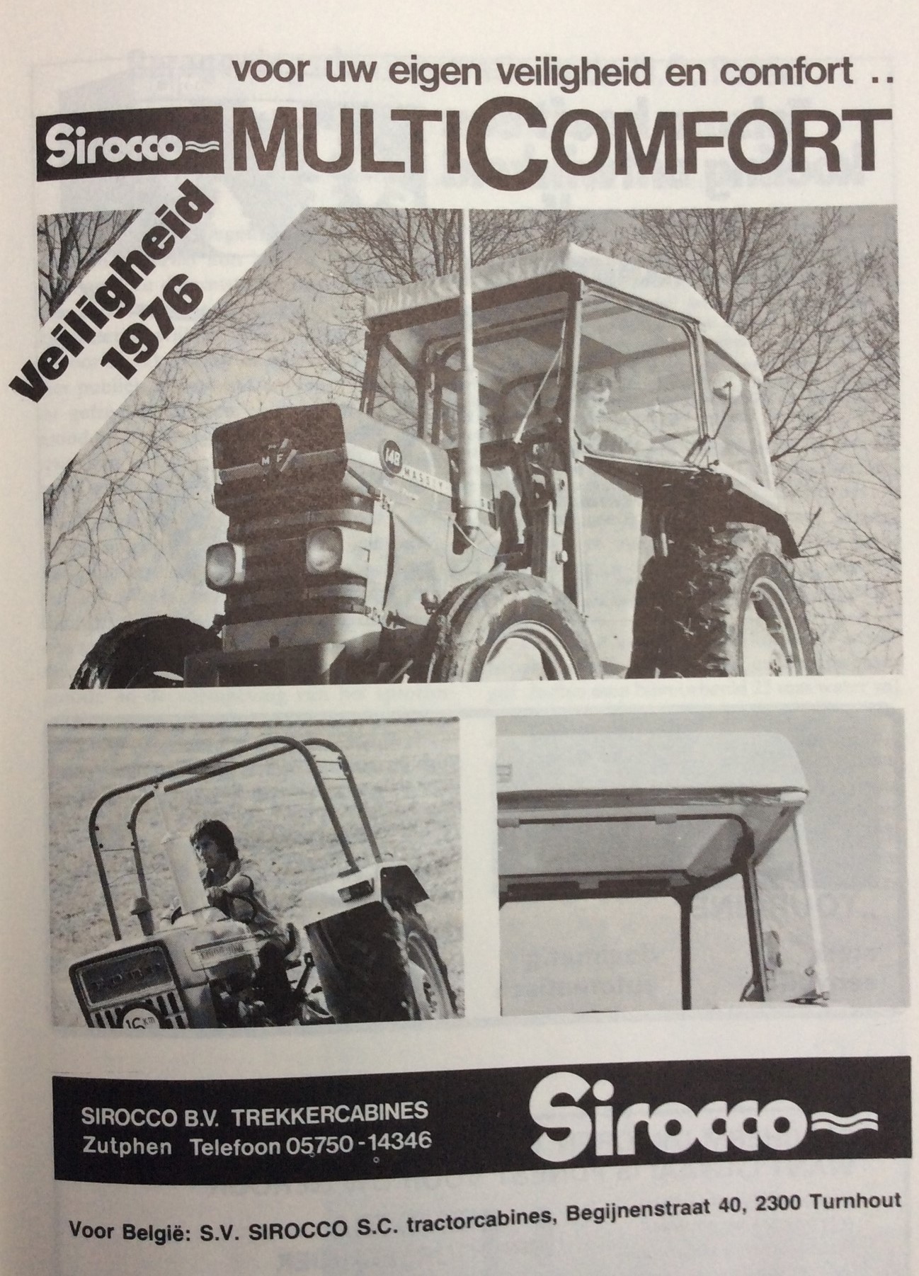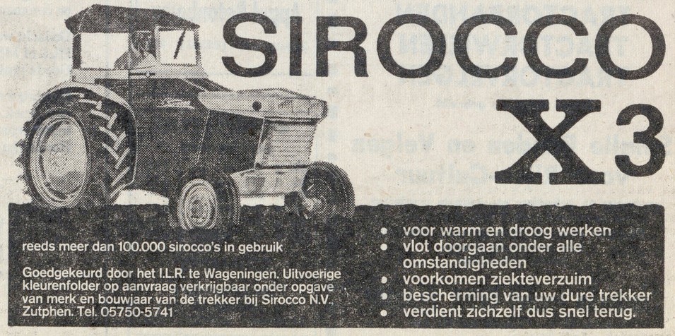 In 1972 wordt de productie van tuinmeubelen gestaakt en gaat Sirocco zich volledig toeleggen op de productie van tractorcabines. In 1974 wordt in Zutphen een tweede fabriek in gebruik genomen en in 1975 wordt de 250.000ste Sirocco-cabine afgeleverd. Dat jaar gaf het bedrijf werk aan 180 mensen en had eigen vestigingen in Duitsland, Engeland en België. Belangrijkste product was toen de Multicomfort veiligheidscabine, gebaseerd op een veiligheidsframe dat met een soepele vinylbekleding tot een cabine kon worden uitgebreid. De vinylbekleding had tot doel de geluidsresonanties te beperken. In die periode nam het aantal merken en typen goedgekeurde cabines sterk toe en de grootste concurrentie voor Sirocco kwam vooral uit de hoek van de tractorfabrikanten die hun trekkers van fabriekswege met volledig gesloten geluidsarme veiligheidscabines gingen uitleveren. Sirocco dat duidelijk te lang gefocust had op de trekkerjas en te laat startte met de ontwikkeling van een ruime universele geluidsarme veiligheidscabine kreeg het moeilijk en werd dan ook in 1979 failliet verklaard.
