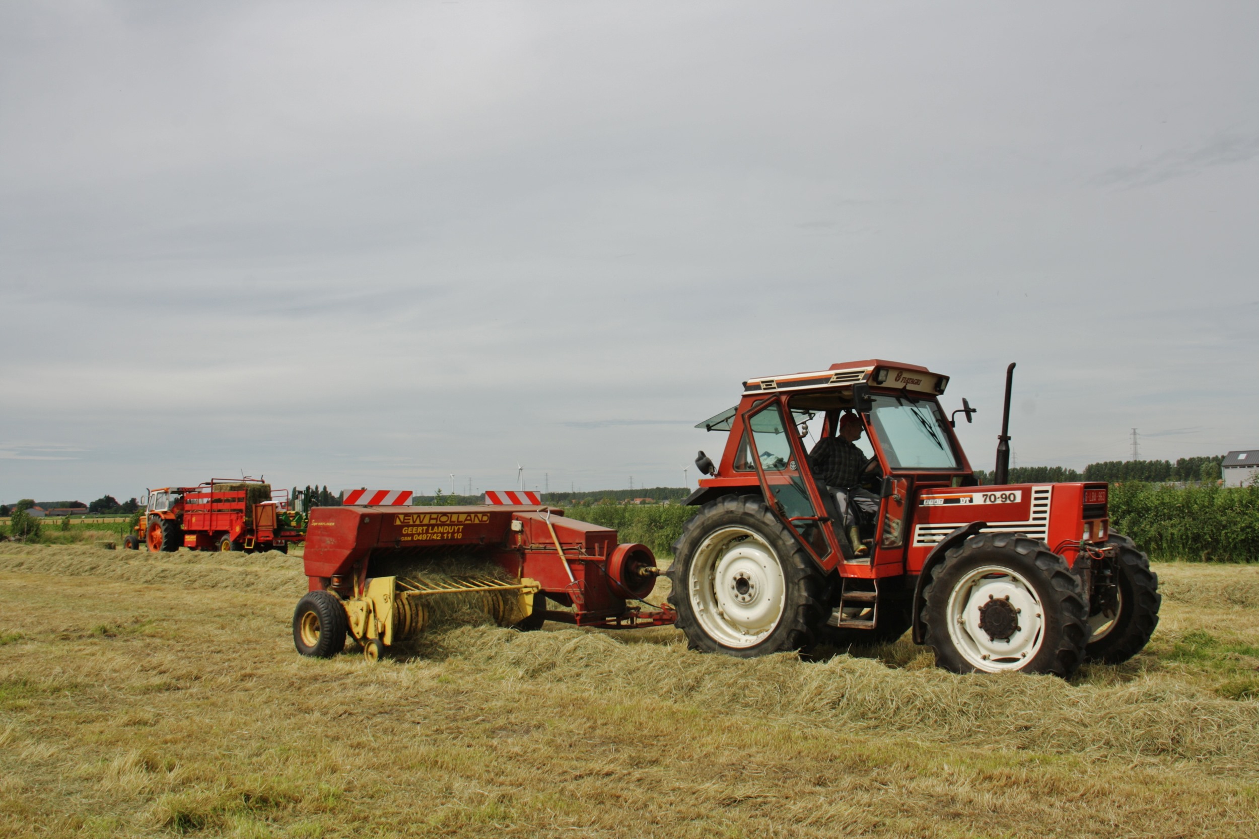 Loonwerker Landuyt Geert uit Kleit, gras persen met Fiat 70-90 en New Holland pers .(Foto Maarten Martens)