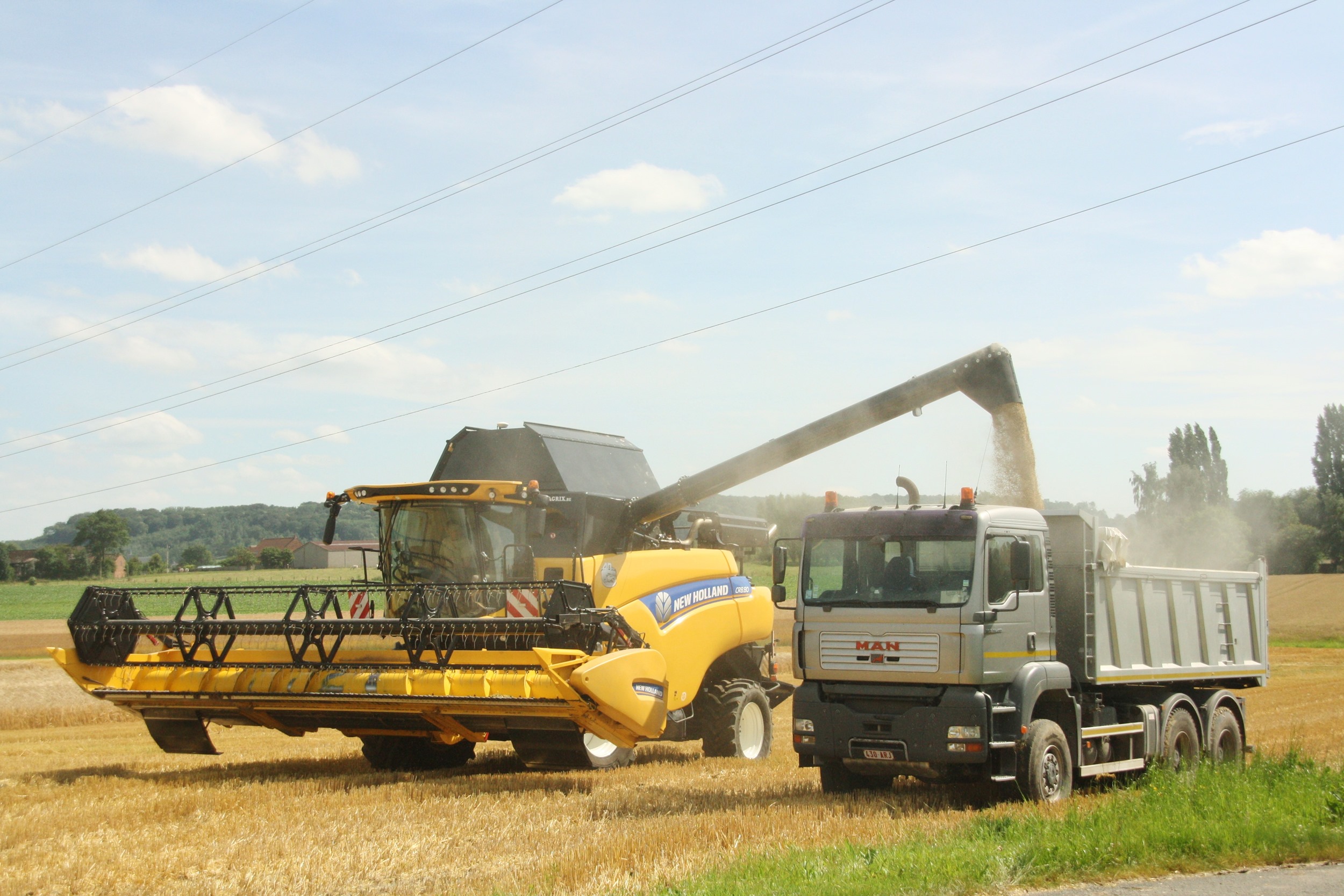 Loonbedrijf Clement uit Montroeul-Au-Bois met hun New Holland CR 8.80 graan aan het lossen op hun M.A.N TGA 33-410. (Foto Davy Tandt)