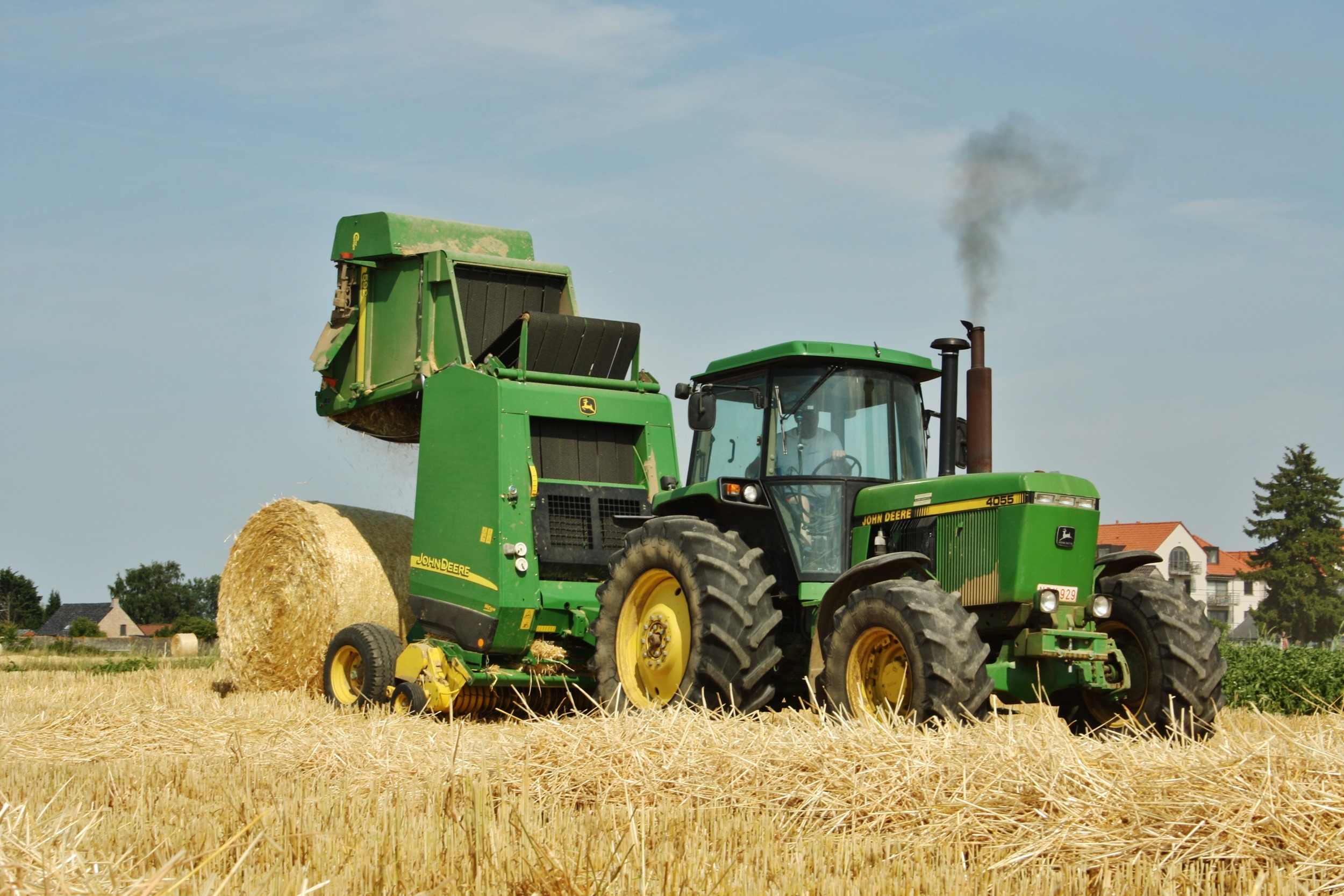 Loonbedrijf Baeyens uit Ollignies, gerststro persen met John Deere 4055 en John Deere 592 pers. (Foto Maarten Martens)