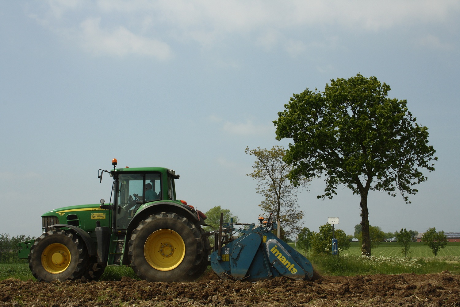De laatste gronden werden bewerkt, maar ook de zwaardere velden moeten bewerkt worden. Op dit veld werd gewerkt met een Imants spitmachine, die aan een John Deere 7530 hing van loonbedrijf Mattheeuws uit Zomergem. (Foto Maarten Martens)
