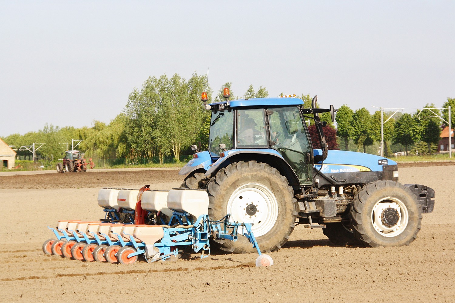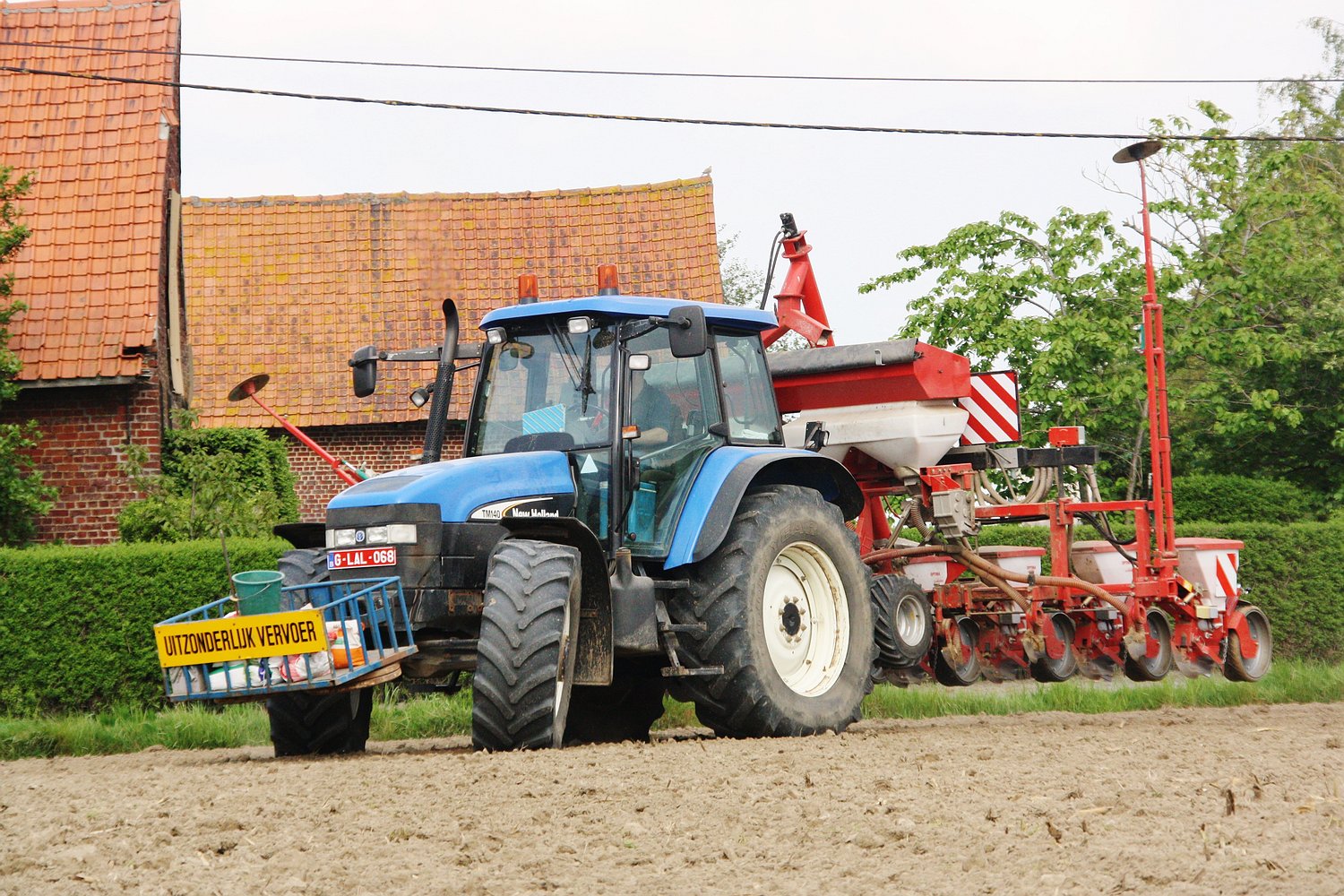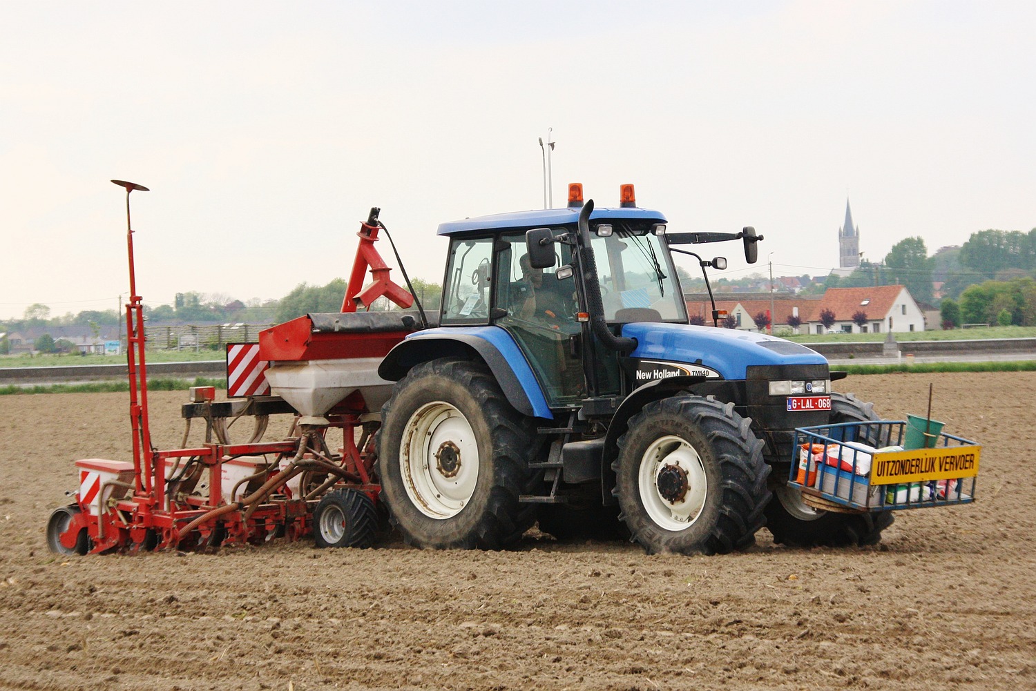 Een in Vlaanderen minder bekende zaaimachine vinden we terug bij loonbedrijf Spruytte G uit Houthulst, deze 8-rijïge Monosem zaaimachine zien we achter zijn New Holland TM 155 hangen. (Foto Davy Tandt)