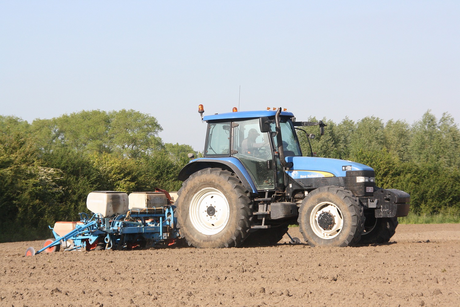 Ook was het druk bij loonbedrijf Vereecke uit Hooglede om de velden in te zaaien, dit gebeurde met deze New Holland TM 140 en 8-rijïge Accord Optima zaaimachine. (Foto Davy Tandt)
