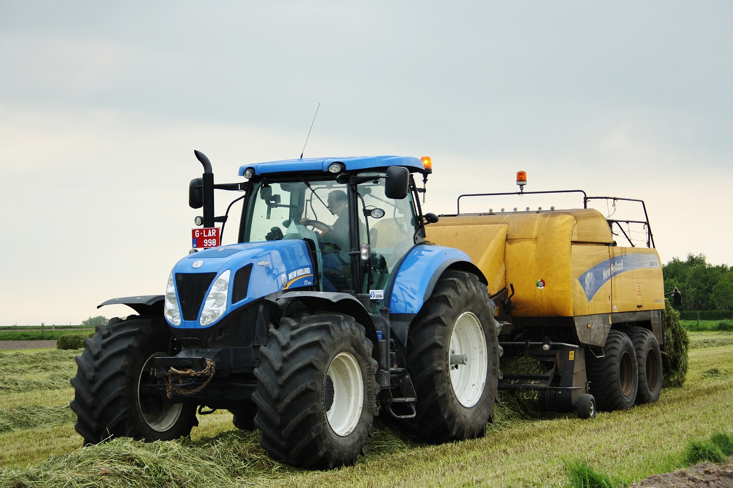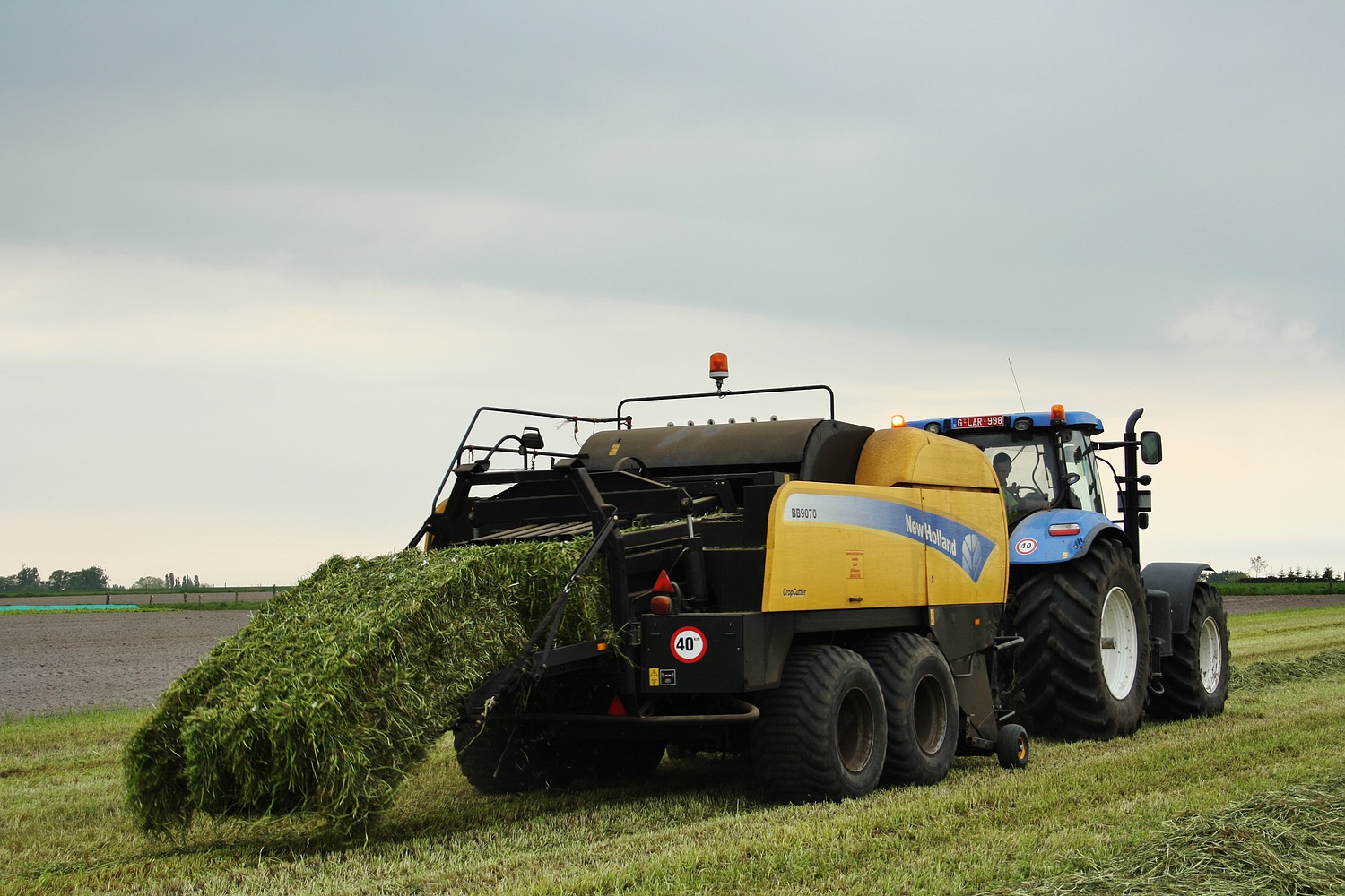 Tussen de hakselaars door werden ook al heel wat voordroog pakken geperst. Loonwerker Bauwens uit Waarschoot kwam hier buiten met zijn New Holland team, bestaande uit een NH T 7.250 en een New Holland BB 9070. (Foto Maarten Martens)