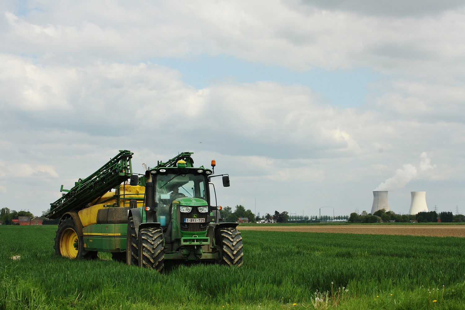 Sproeiwerken worden uiteraard ook op de foto gezet. Dit veld is afgewerkt, de John Deere 6170R met John Deere R962i rijd net weg met de koeltorens van de kerncentrale te Doel. (Foto Maarten Martens)