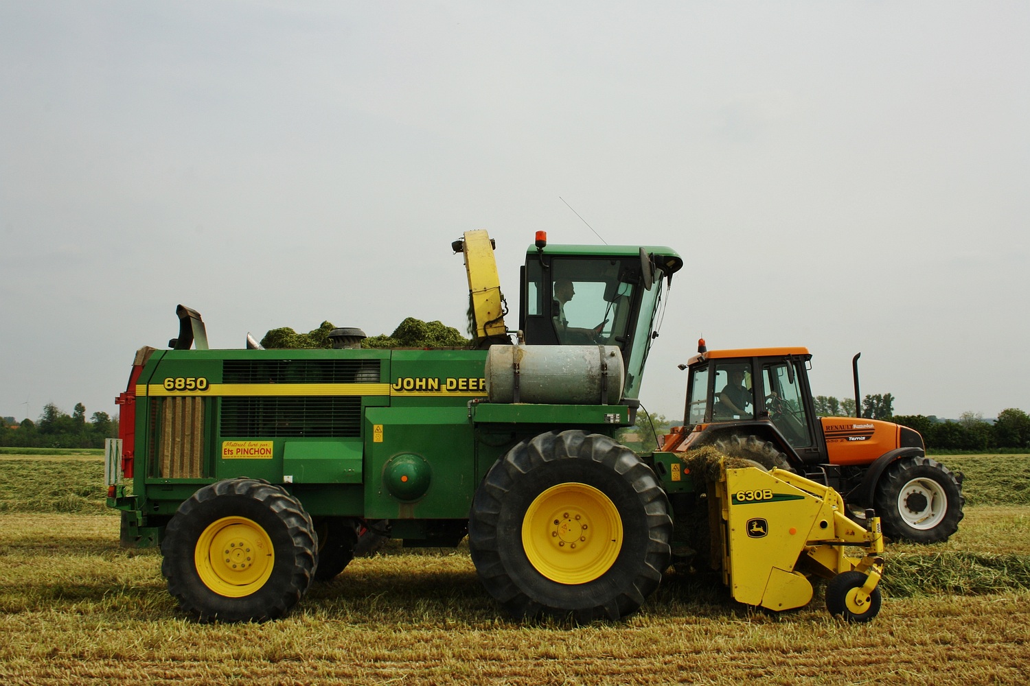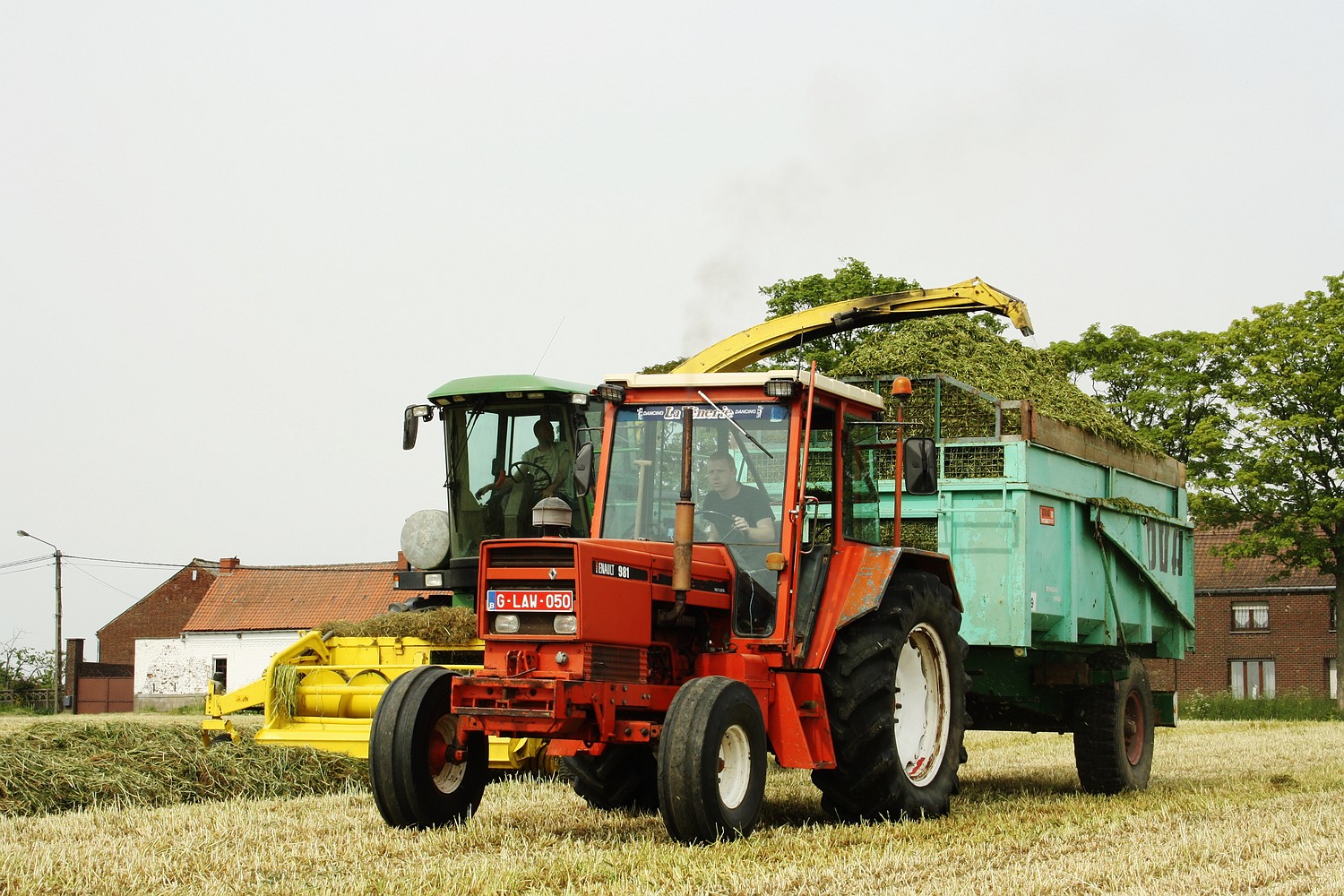 In Wallonie is het de gewoonte dat de landbouwer zelf met een kipper onder de hakselpijp rijd. Bij landbouwer Bruneau uit Pipaix is het loonwerker Mestdag uit Gaillaix die met een John Deere 6850 kwam hakselen, Bruneau leverder een Renault 981 met Ova kipper en Renault Temis 650Z met Brimont kipper. (Foto Maarten Martens)
