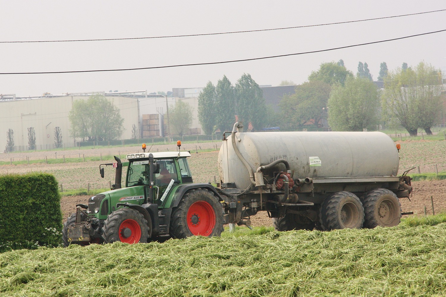 Op de laatste plaatsen wordt nog een 1ste snede gras weg gehaalt, als ook de laatste akkers voorzien voor maïsland krijgen de benodigde drijfmest hiervoor zet loonbedrijf De Maré uit Ardooie onder andere deze Fendt 820 met Wicom aalton in. (Foto Davy Tandt)