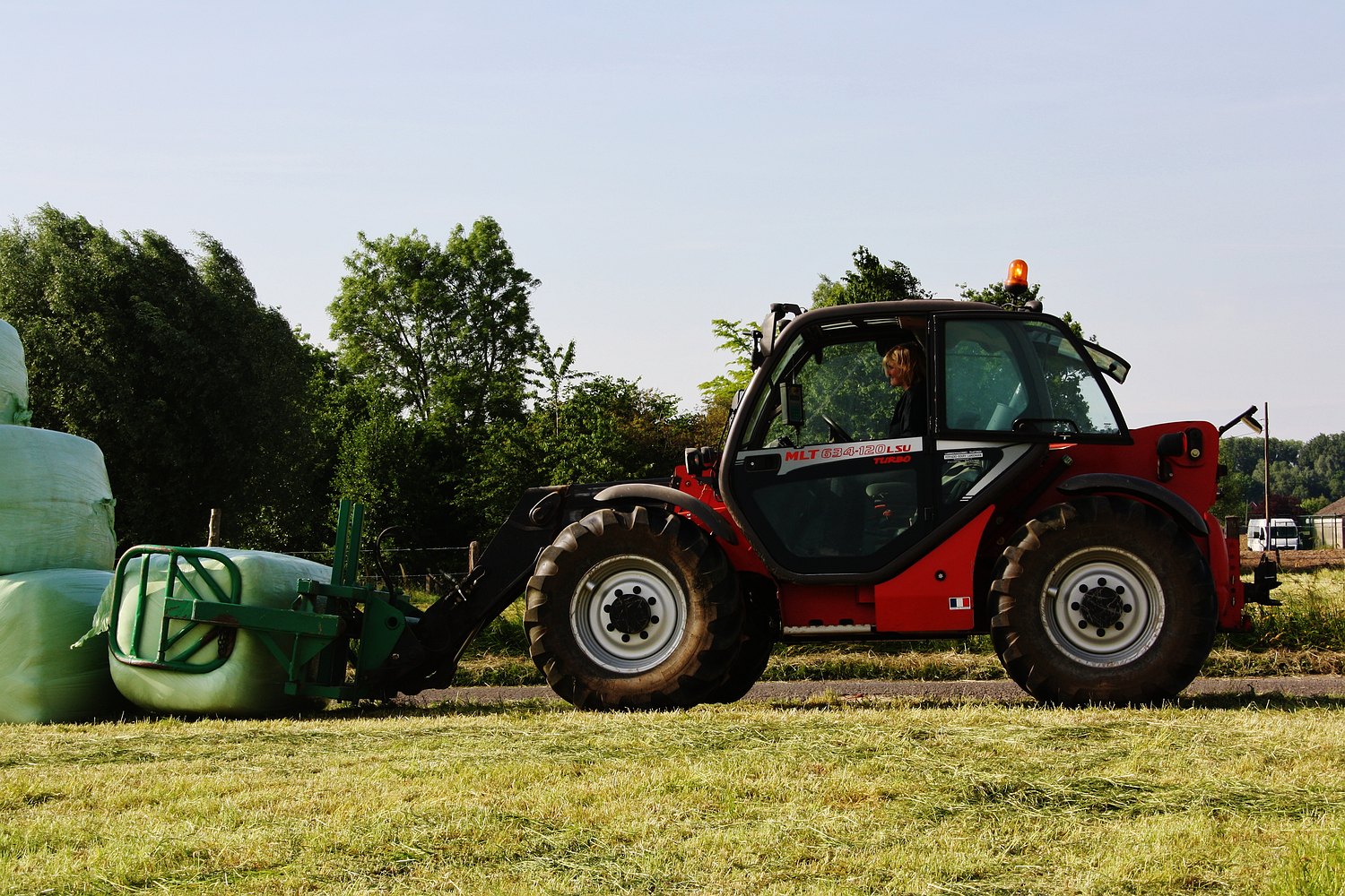 Naast het persen van de pakken gras, staat loonbedrijf Dewulf-Vandoorne uit Ledegem ook in voor het transporteren van de pakken, dit met hun Manitou MLT 634-120. (Foto Davy Tandt)