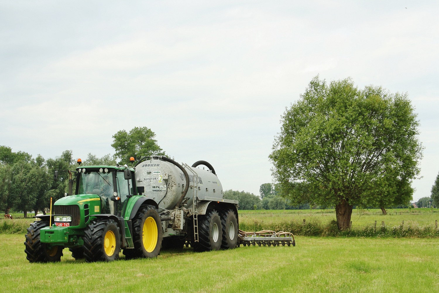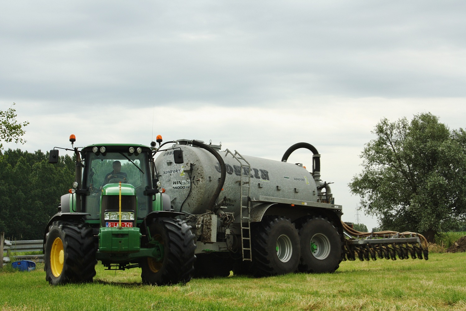 Heel wat gras zit weer in pakken of in een kuil, hoogtijd om nog eens de weides te bemesten. In Ursel gebeurt dit met een John Deere 7530 en Joskin Komfort 14.000l van loonwerker De Baere. (Foto Maarten Martens)