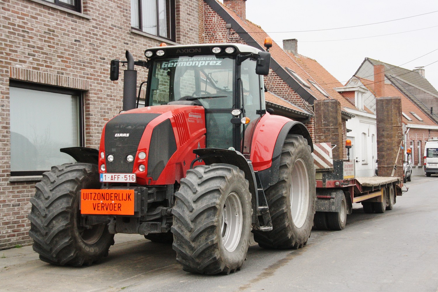 Grondwerken Germonprez uit Meulebeke zet deze opvallende maar knappe rode Claas Axion met dieplader in voor het transport van de graafmachines. (Foto Davy Tandt)