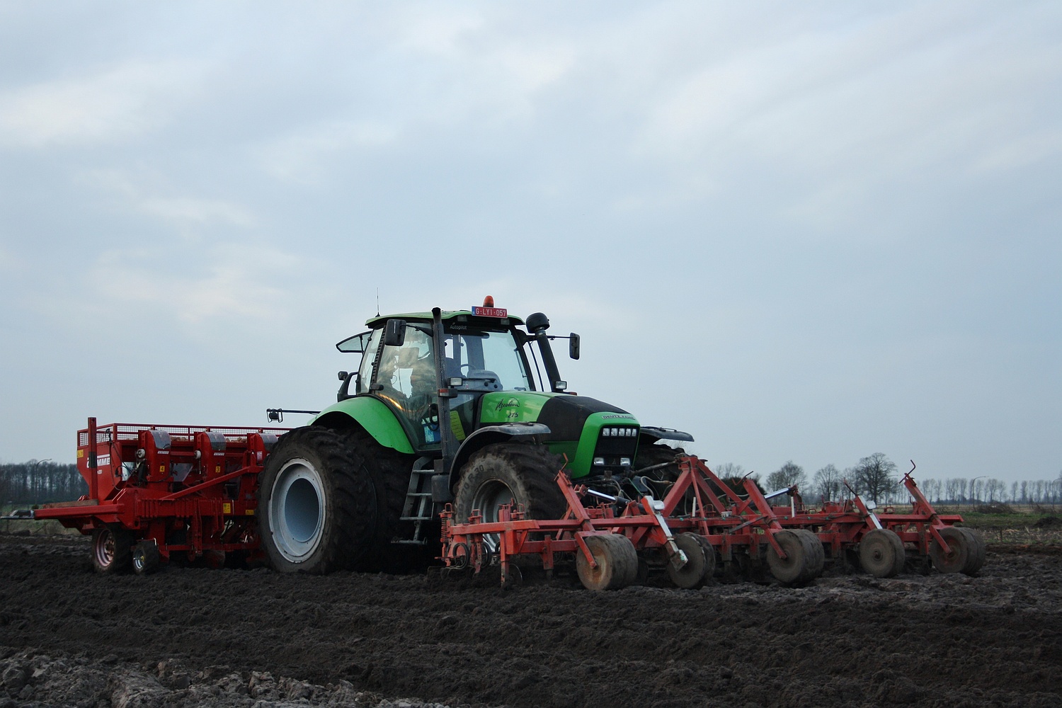 De vroege aardappelen worden volop geplant. De één is daar al meer voor ingespannen dan de andere. Deze landbouwer plant ze wel in stijl met een Deutz Agrotron 215 met fronteg en achteraan een 8 rijige Grimme planter. (Foto Maarten Martens)