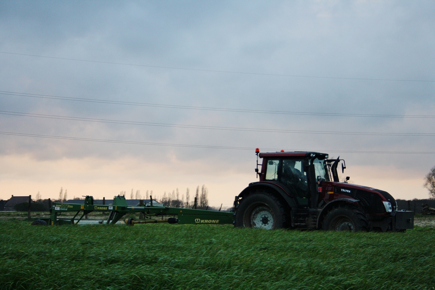 Al enkele landbouwers profiteerden van het vroege lenteweer om al een snede gras te maaien. Hier maait loonwerker Ginneberge uit Adegem gras met een Valtra T 193 en Krone maaier. (Foto Maarten Martens)