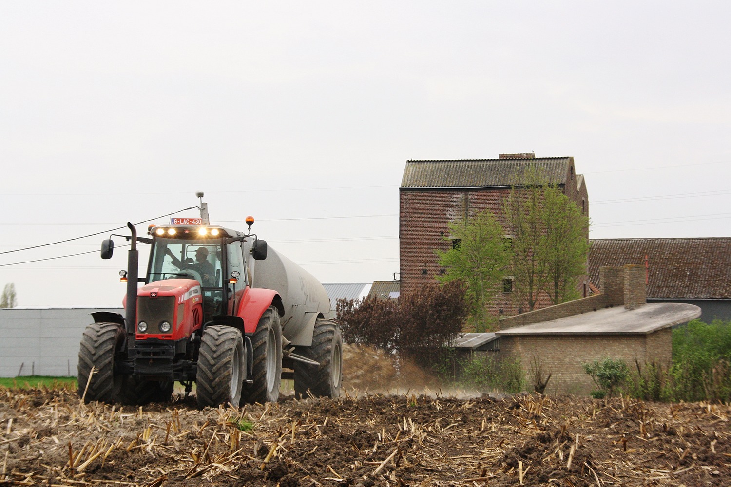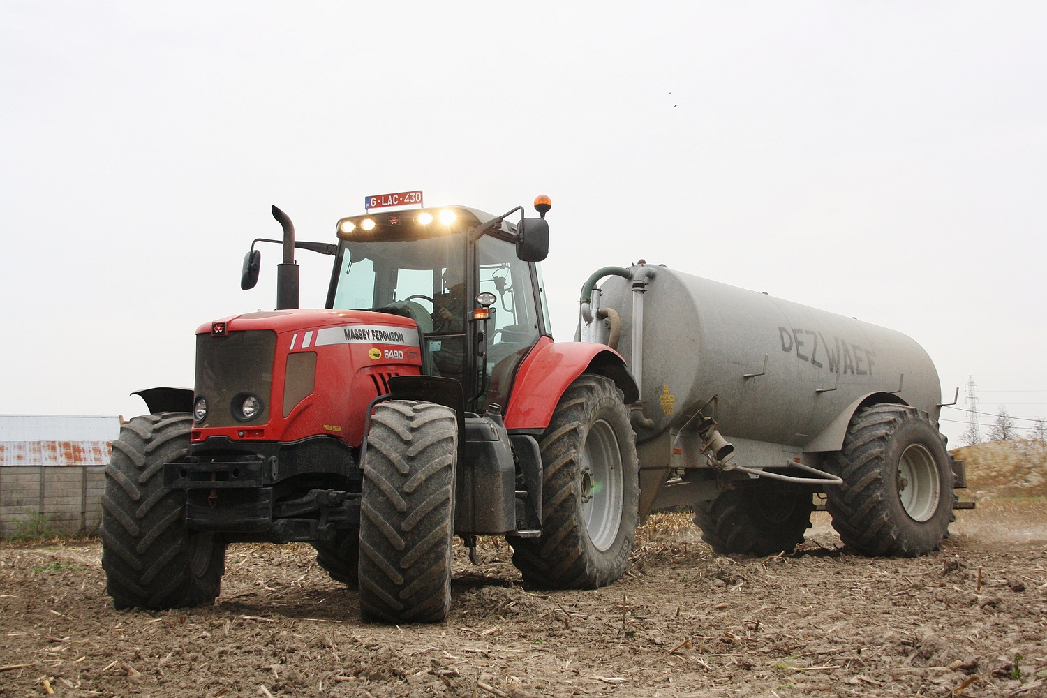 Menig landbouwer en loonwerker werkt goed door tijdens deze droge dagen, hier word de drijfmest gespreid door een Massey Ferguson 6490 met een Dezwaef aalton. (Foto Davy Tandt)