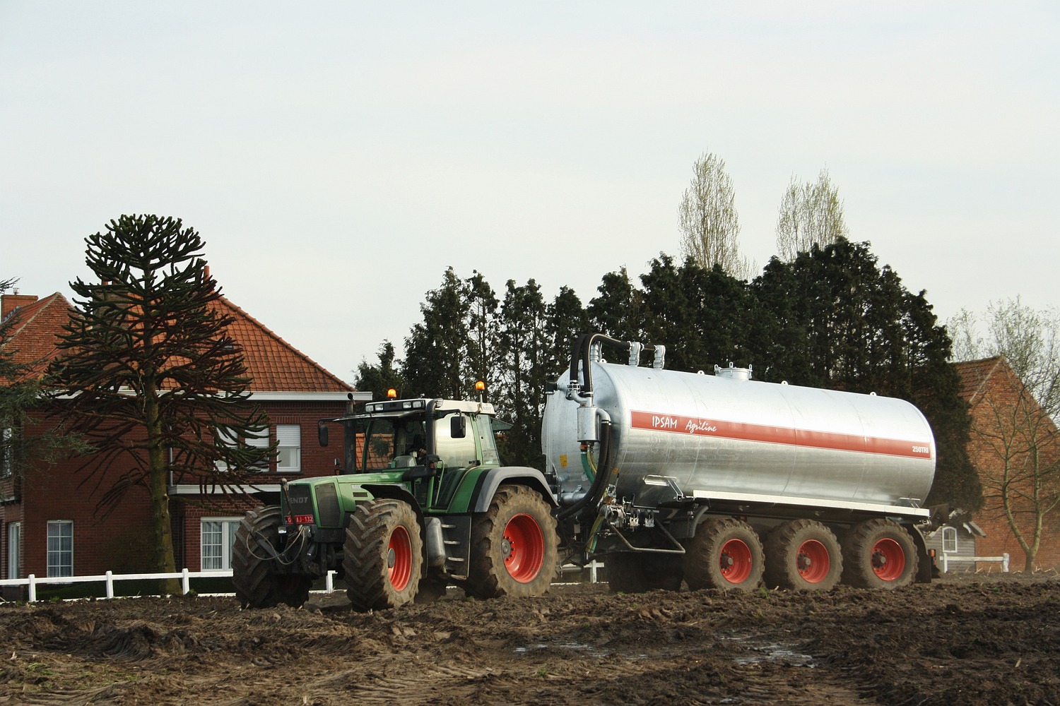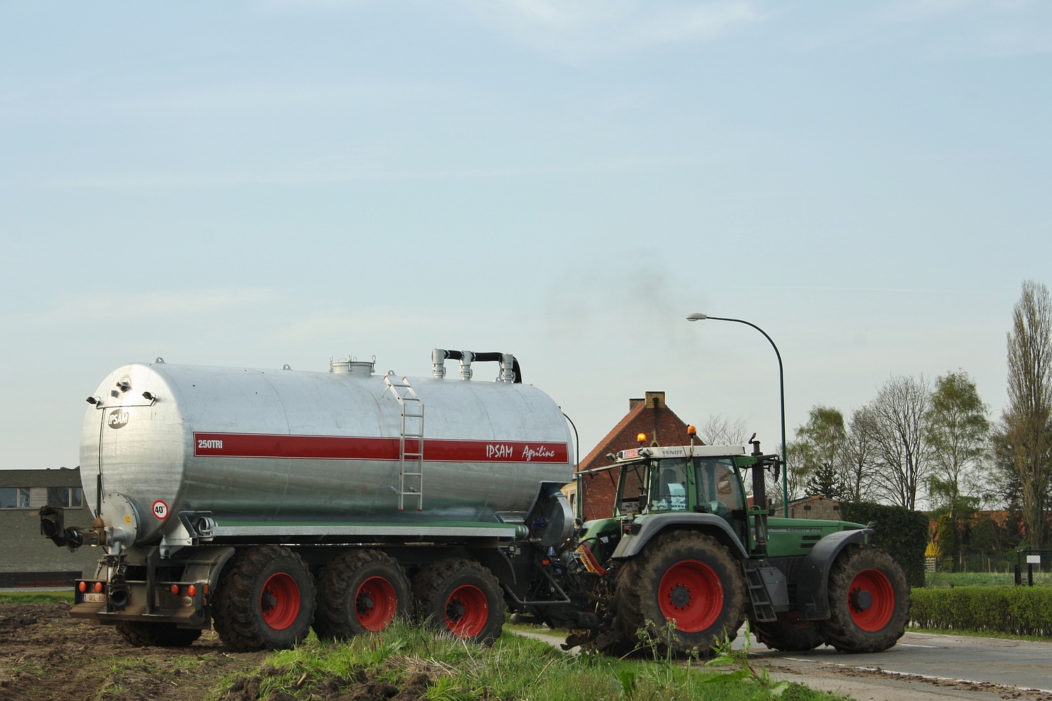 Nagelnieuw alaam zien we bij het loonbedrijf van Hendrik Van Hulle uit Aalter-Brug, waar men een nieuwe Ipsam Agriline inzet om de drijfmest te voeren. Een Fendt Favorit 822 trekt de 3assige aalton. (Foto Maarten Martens)