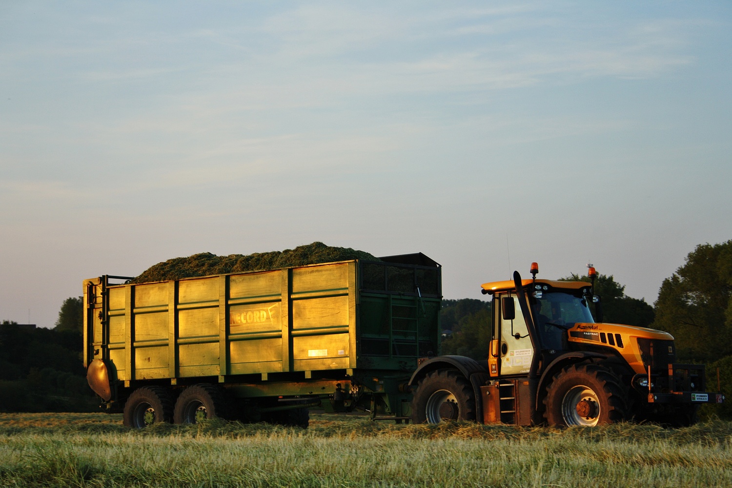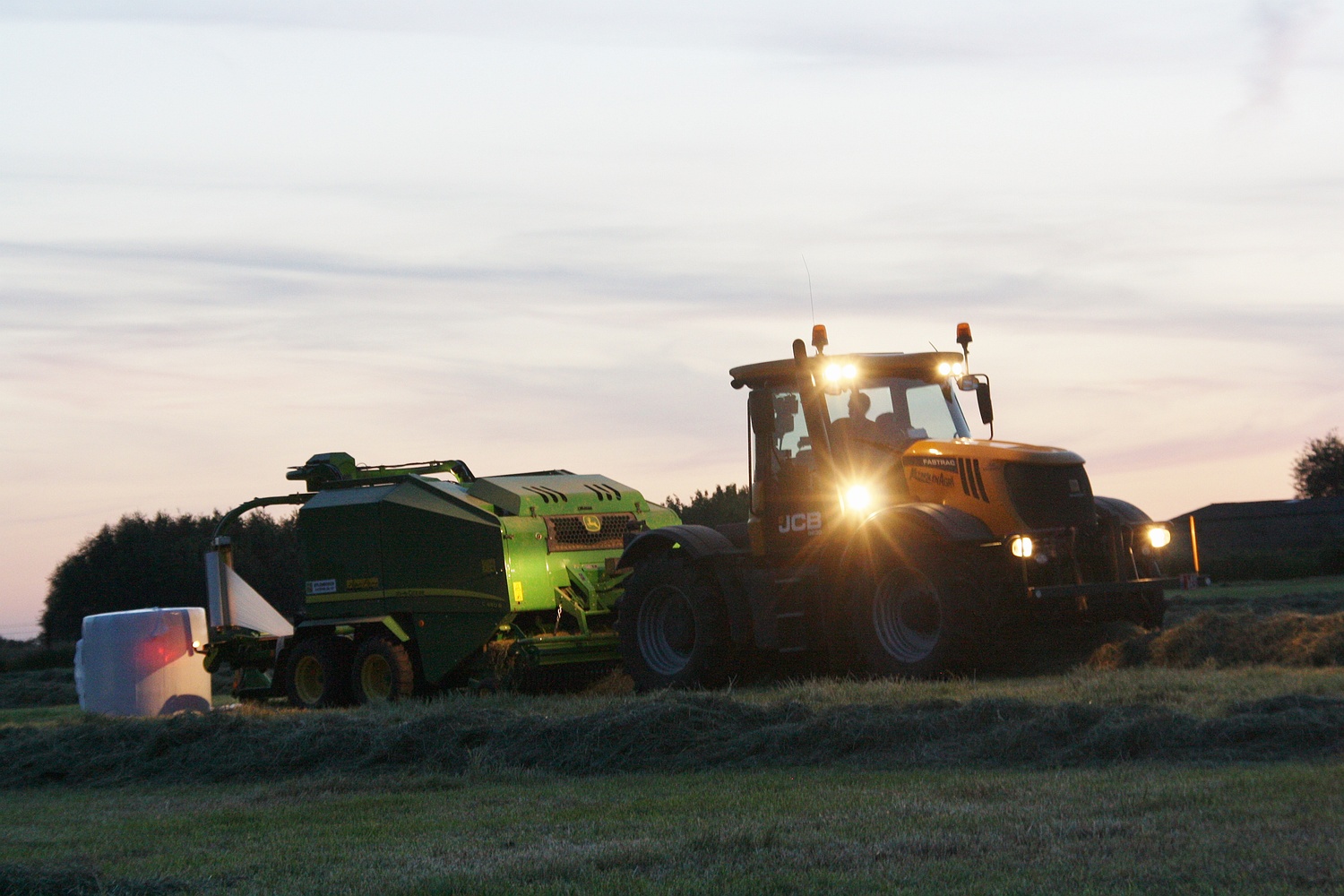 De avond valt, maar dit betekend niet het sein van stoppen voor de JCB Fastrac 3230 met een John Deere C 440 R wikkelpers van loonbedrijf Eylenbosch uit Brussegem. (Foto Davy Tandt)