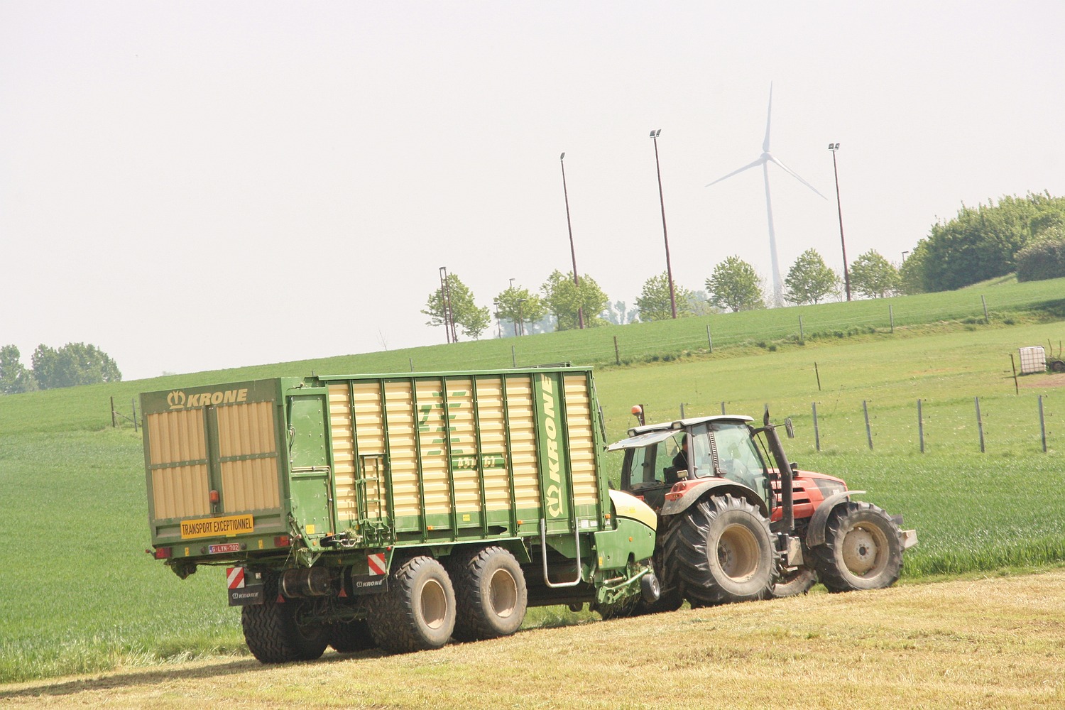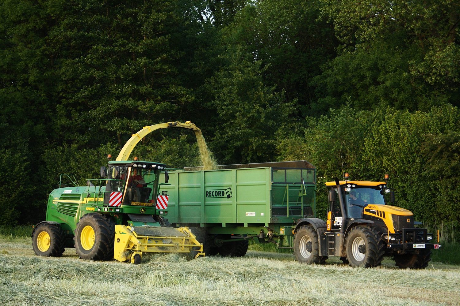 In het prachtige landschap van Kobbegem was de hakseltrein van loonbedrijf Eylenbosch uit Brussegem aan het werk. Daar zagen we in het mooi golvend decor een John Deere 7450 hakselaar, met daarnaast een JCB Fastrac 3230 met groene Record silagewagen. (Foto Maarten Martens)