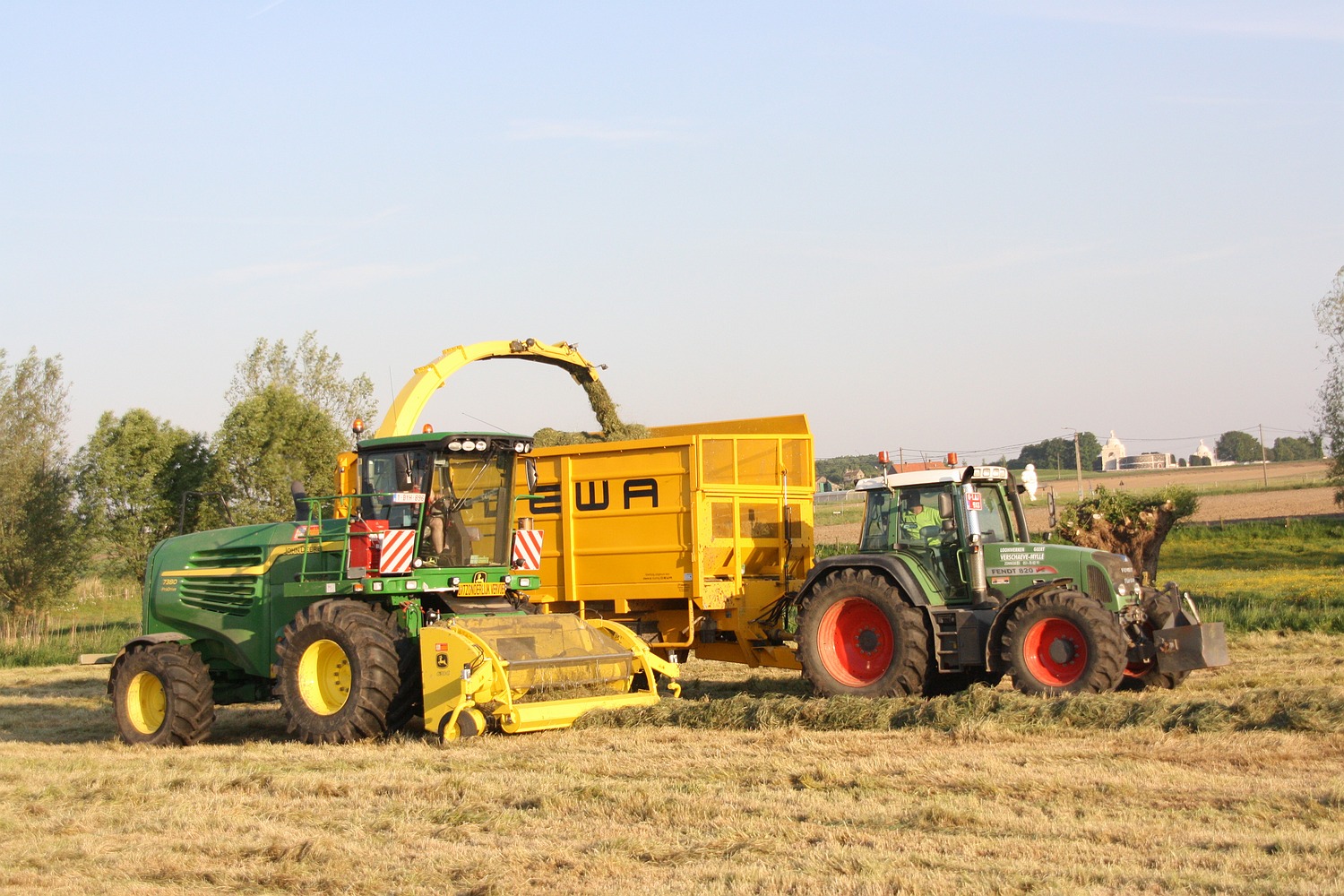 Nabij het oorlogskerkhof van Passendale was loonbedrijf Verschaeve-Mylle druk in de weer met hun nieuwe John Deere 7380 Pro Drive samen met hun Fendt 820 met DEWA silagewagen en hun Fendt Favorit 816 met Record silagewagen. (Foto Davy Tandt)