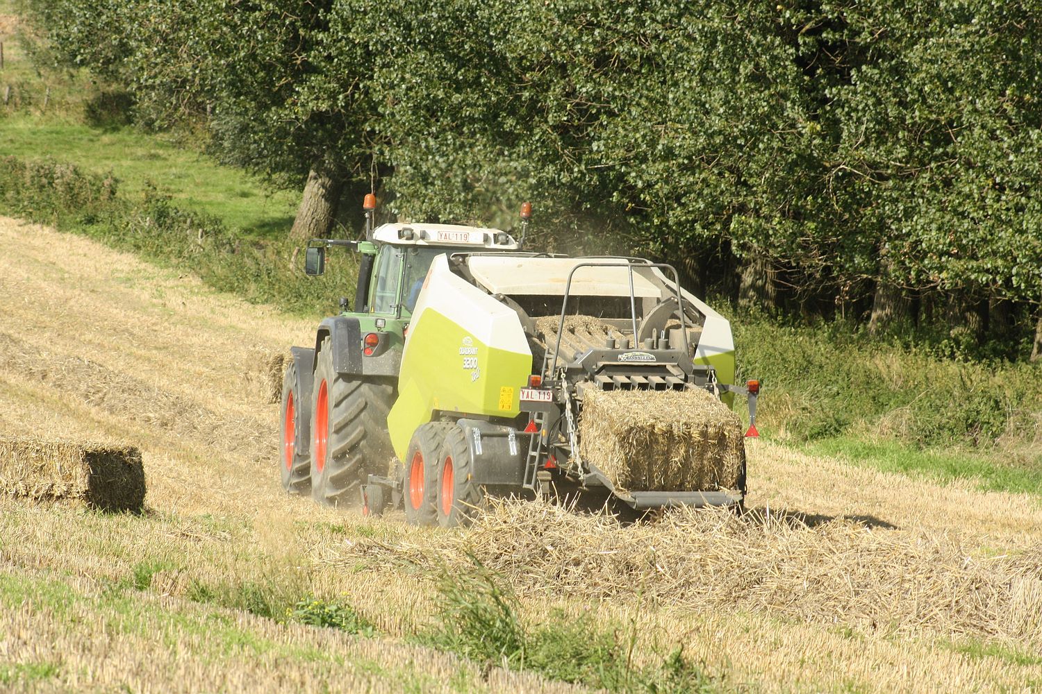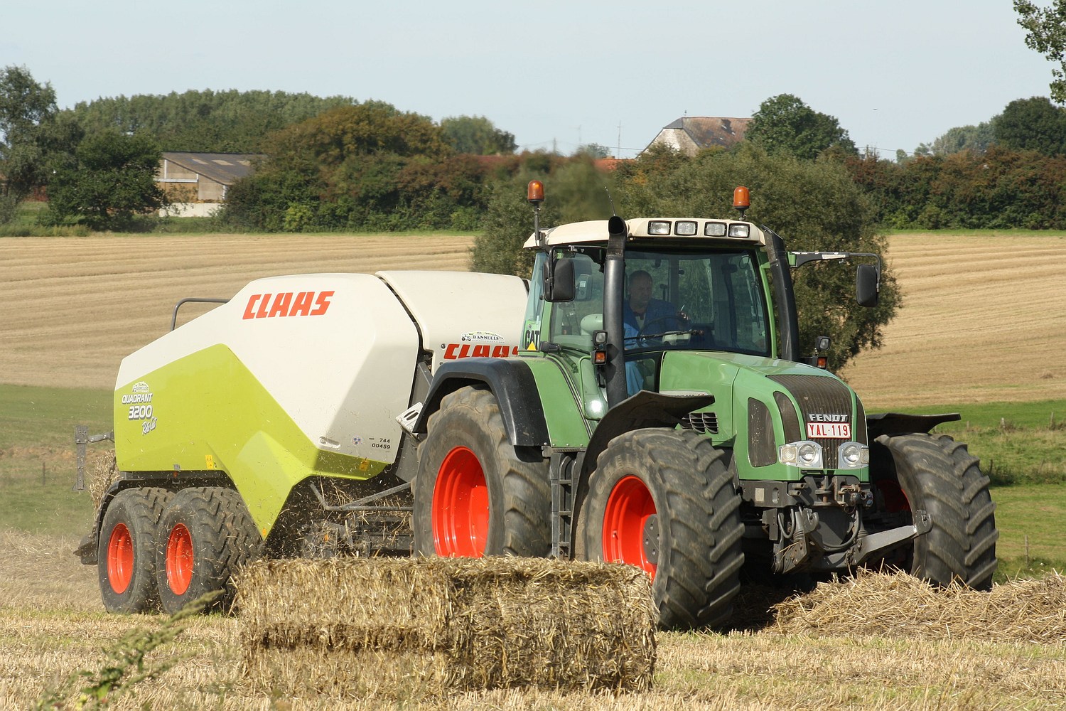 Er ligt nog heel wat stro op de velden, de één kiest ervoor om het te laten liggen, de andere laat het toch nog persen. Deze Fendt Vario 926 met Claas Quadrant 3200 van Luc Siraux uit Mignault perst stro die zijn goudgele kleur al verloren heeft. (Foto Maarten Martens)