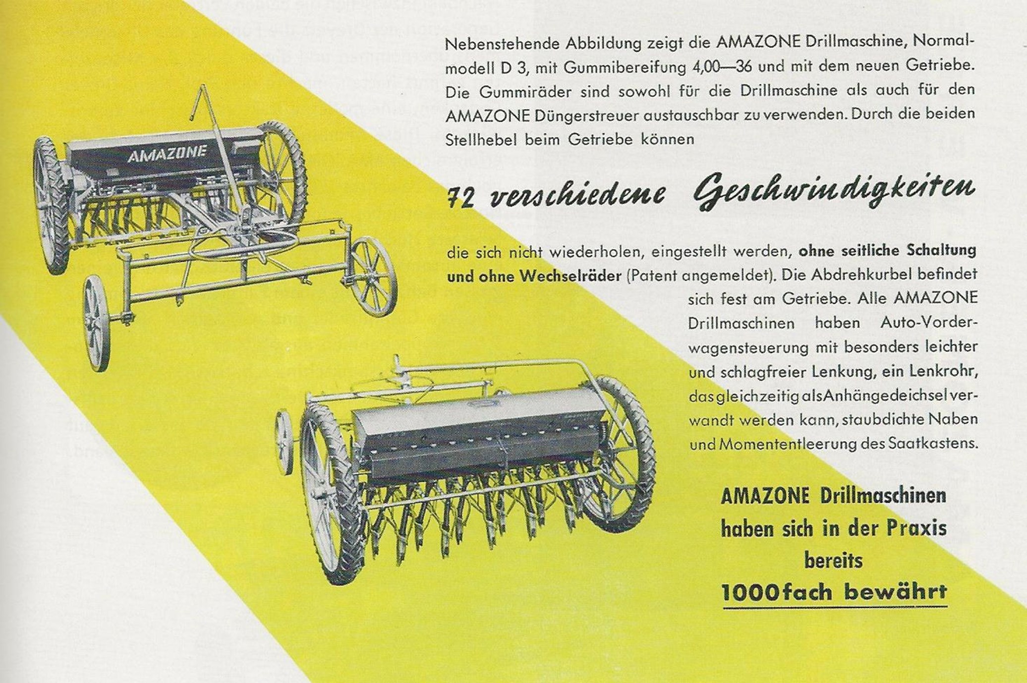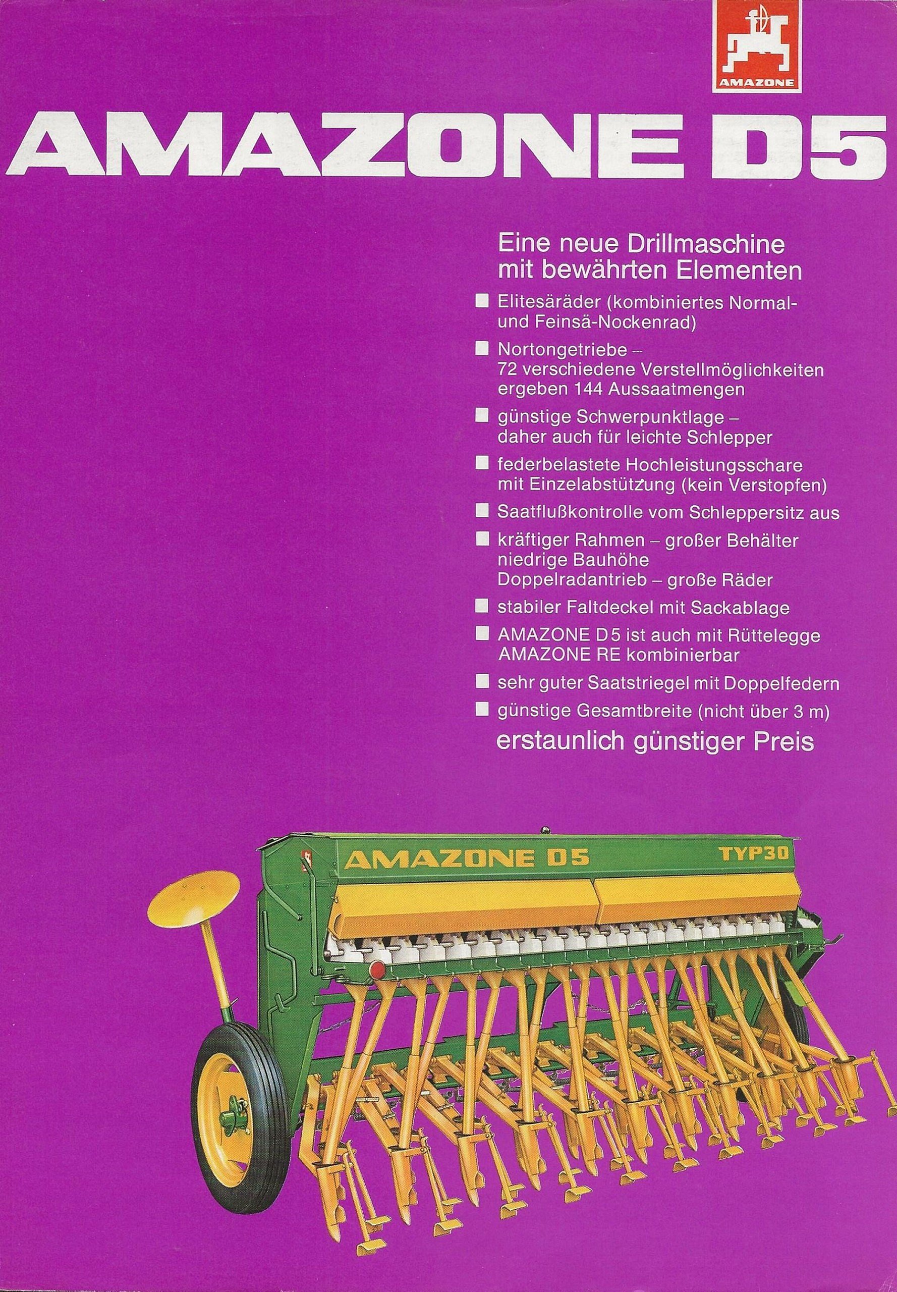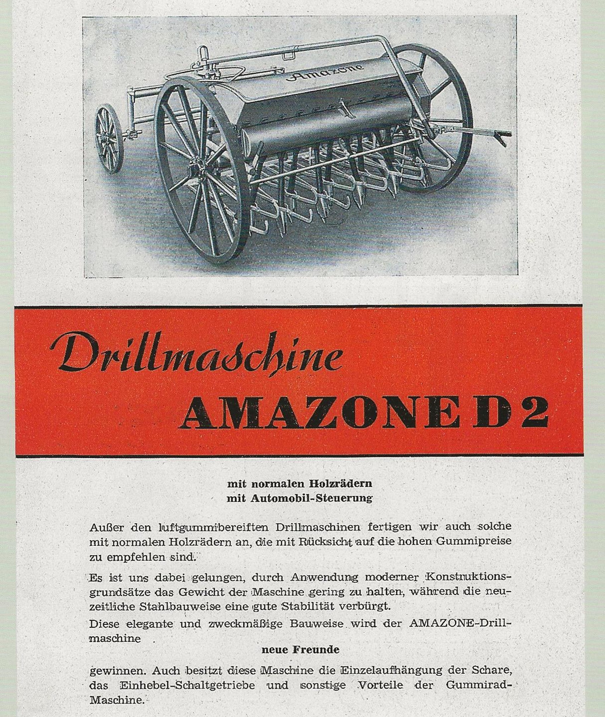 De eerste Amazone-zaaimachines kregen de aanduiding D1 mee, waar de D stond voor Drillmaschine (zaaimachine). De D1 had een werkbreedte van 2 meter en door het verzetten van een hefboom kon eenvoudig worden overgeschakeld van groot naar fijn zaaigoed, voor het zaaien van onder andere wortelen, klaver, gras en stoppelknollen. Hierdoor was de D1 zaaimachine interessant voor Noord-Duitsland en het Rijnland waar heel veel stoppelknollen werden geteeld niet alleen als veevoer, maar ook als vanggewas. Bijzonder aan de Amazone D1-zaaimachine was dat in tegenstelling tot de andere zaaimachines van die tijd de tandwielen van de tandwielkast niet moesten worden gewisseld bij het zaaien van grovere of fijnere zaden.