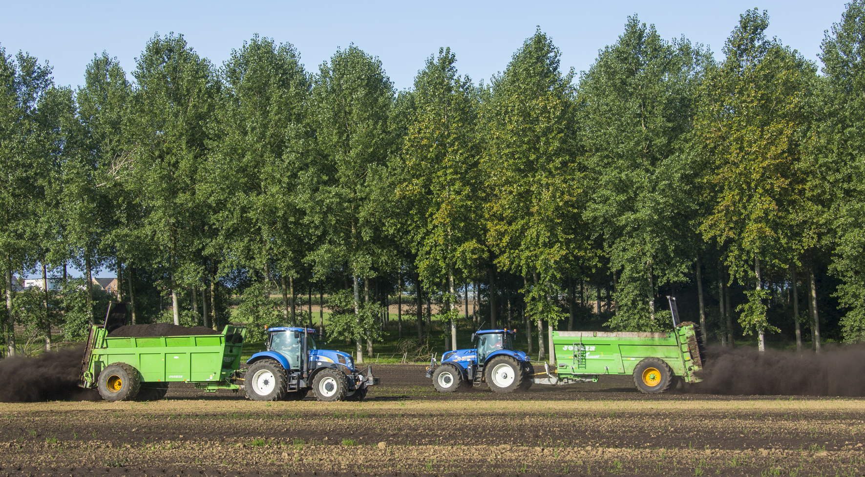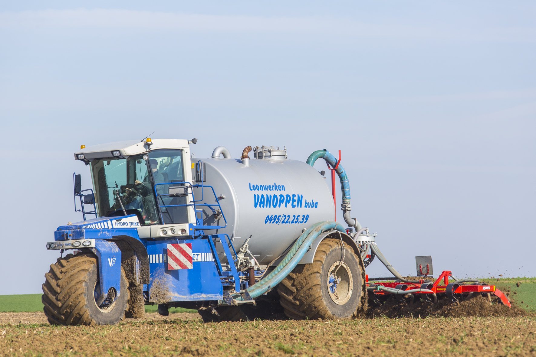 In 2013 kochten Peter en Wendy een Rebuild Vervaet, op vraag van het bedrijf werd dat een blauw exemplaar. “We wilden herkenbaar zijn en bovendien past de kleur van de zelfrijder goed bij onze tractoren. Of we die kleur opnieuw zouden kiezen, is twijfelachtig. De wisselstukken zijn rood en moeten telkens eerst blauw gespoten worden.” In 2015 kreeg de zelfrijder een klapband op de baan, de schade was aanzienlijk. Het is voor zulke fratsen dat de loonwerker nu een verzekering afsloot, noem het onvoorziene omstandigheden. Vooral de dure oogstmachines en de triplemaaier zijn opgenomen in deze polis. Een machinebreukverzekering hebben ze niet, aangezien op elke machine enkele jaren fabrieksgarantie zit. Omdat de Vervaet onmisbaar werd op grasland, is hij toch hersteld. In februari komt er zelfs een nieuwe Schuitemaker-injecteur op. Voor het aanvoeren van mest hebben ze twee 3-assers van Dezwaef en Peecon. Bij kleinere boeren injecteren ze met een Veenhuis-ton van 12,5 m³ die in hondengang kan, een klus voor de Case IH-trekker. Verder is er nog een Peecon-tandem van 18 m³ voor boeren die liever geen 3-assers op het land willen. “Elke boer heeft zijn gedacht, wij proberen te voldoen aan wat de klant vraagt”, klinkt het. Met twee Joskin Tornado’s maken we het mestverhaal compleet. Om structuurbederf tegen te gaan, wordt 90 % van de vaste mestproducten geladen met de Hitachi-bandenkraan.