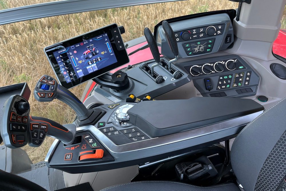 Tijdens een evenement begin juli in Beauvais testten wij als een van de eersten de nieuwe Massey Ferguson 8S Xtra-modellen. Bij het instappen valt meteen de ruime cabine op, met een inhoud van 3,4 m³. De opnieuw ontworpen matzwarte uitlaat met de initialen van het merk heeft een smal, gestroomlijnd profiel dat perfect aansluit bij de rechterstijl van de cabine voor optimaal zicht naar voren.