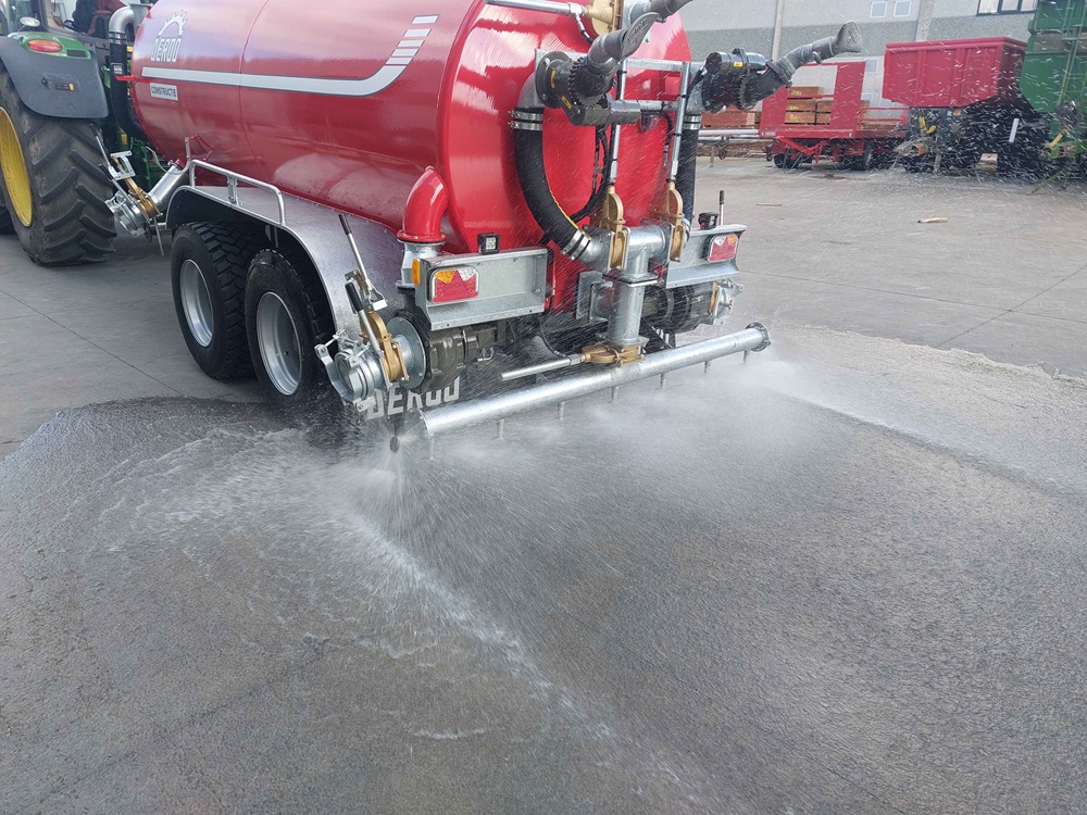De tank is uitgerust met 3 sproeikoppen. De middelste is naar boven gericht om het plafond te reinigen, de buitenste 2 staan gemonteerd op een draaikrans zodat ze kunnen gericht worden om muren of vloer af te spuiten. Onderaan voorzag Deroo Constructie een sproeiboom met 9 koppen, waarvan 2 naar buiten gericht zijn, om de stalvloer af te spuiten. Aanzuigen van water en reinigen van de stallen gebeurt door middel van een vacuümpomp in combinatie met turbovuller en turbolosser. Het reinigen gebeurt dus niet door middel van hoge druk, maar door de hoeveelheid water die gebruikt wordt.