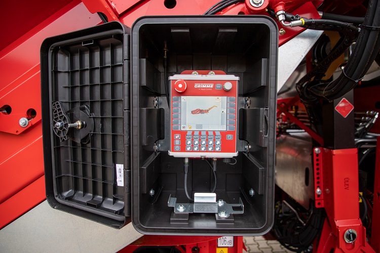 Voor stofvrij en waterdicht opbergen van de bedieningsterminal en andere bedieningsapparaten, zoals bijvoorbeeld de afstandsbediening van een hallenvuller kunnen vanaf nu alle GRIMME stortbunkers met een beschermkast uitgevoerd zijn.