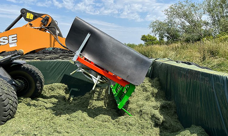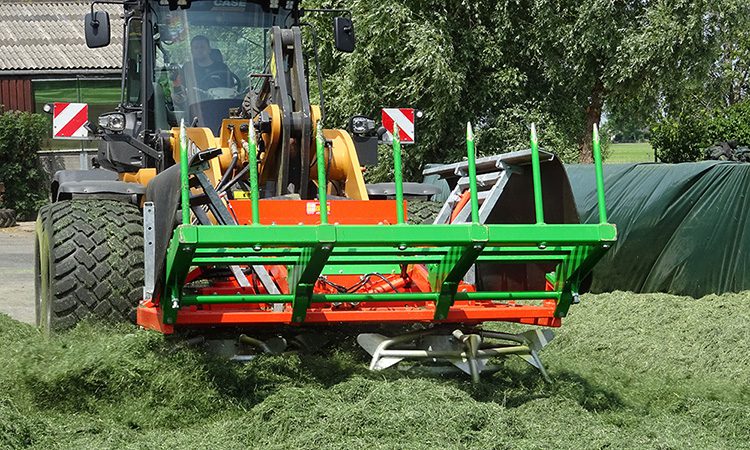 Een hydraulisch opklapbare kuilvork wordt gebruikt om het voer aan het einde van de sleufsilo’s te plaatsen.