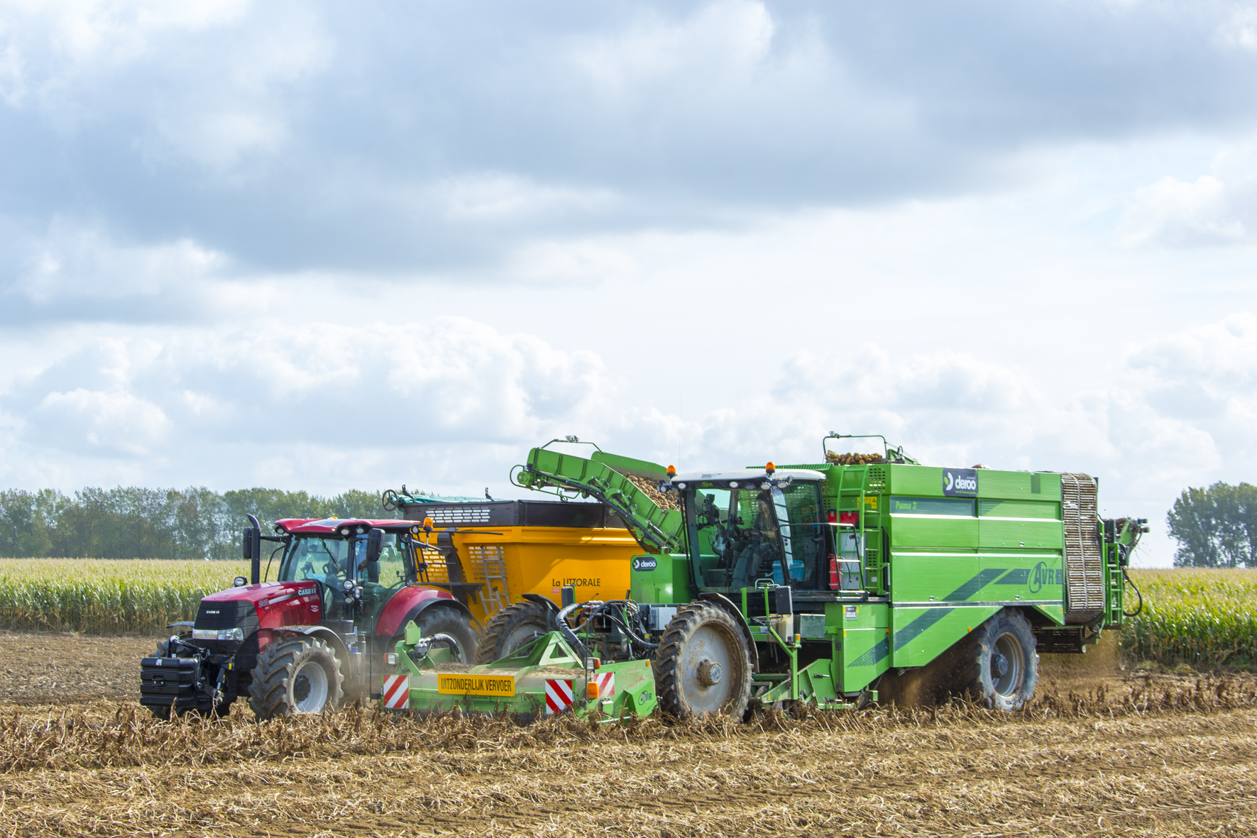 Vanaf 20 juli start de oogst van vroege aardappelen. Vaak gaan ze met twee machines op één perceel aan de slag. De aardappelfabriek stelt twee Dezeure-hooglossers ter beschikking zodat ze één vrachtwagen per team uitsparen en er extra buffer aanwezig is. De loonwerker heeft eveneens twee hooglossers, de recentste is een Deroo van vorig jaar. Voorlopig hebben ze vier 4-rijers en vier 2-rijers voor het rooien. De bedoeling is dat twee van de vier Dewulf 3060 dit jaar plaatsmaken voor een tweede Kwatro, die onderhandelingen zijn lopende. Na twee jaar finetunen samen met Dewulf, staat de eerste Kwatro op punt voor de wortel- en pastinaakoogst. Een tweede exemplaar is dus meer dan welkom. De Grimme Varitron 470 is trouwens ook geschikt voor deze teelten. Terwijl de andere machines rijden tot half januari, rijden de twee AVR Puma’s tot half oktober en dat enkel en alleen in de aardappelen.