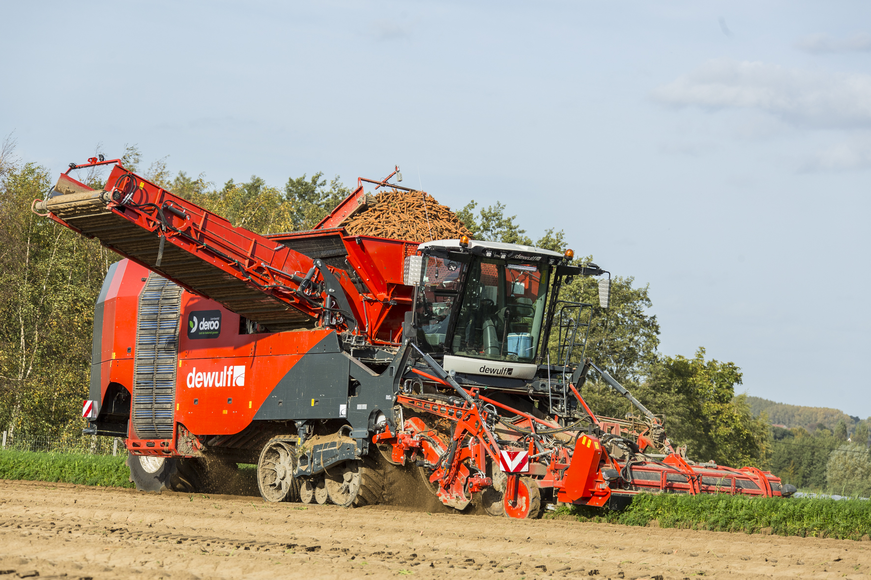 Vorig jaar werd het extreem nat in december. Deroo monteerde drie rupsen onder een Dewulf 3060. Een wereldprimeur genaamd ‘de amfibie’ waarmee ze de wortelen alsnog van het land kregen. De loonwerker heeft vijf rupsstellen die ze met uitzondering van de bonendorsers op alle oogstmachine kunnen monteren. Met een zelfrijdende overlaadwagen werden de wortelen naar het droge gevoerd waar ze ineens door de reinigingsinstallatie gingen. “We moeten creatief zijn om de aanvoer van groenten te verzekeren zodat de fabrieken niet droog komen te staan.”