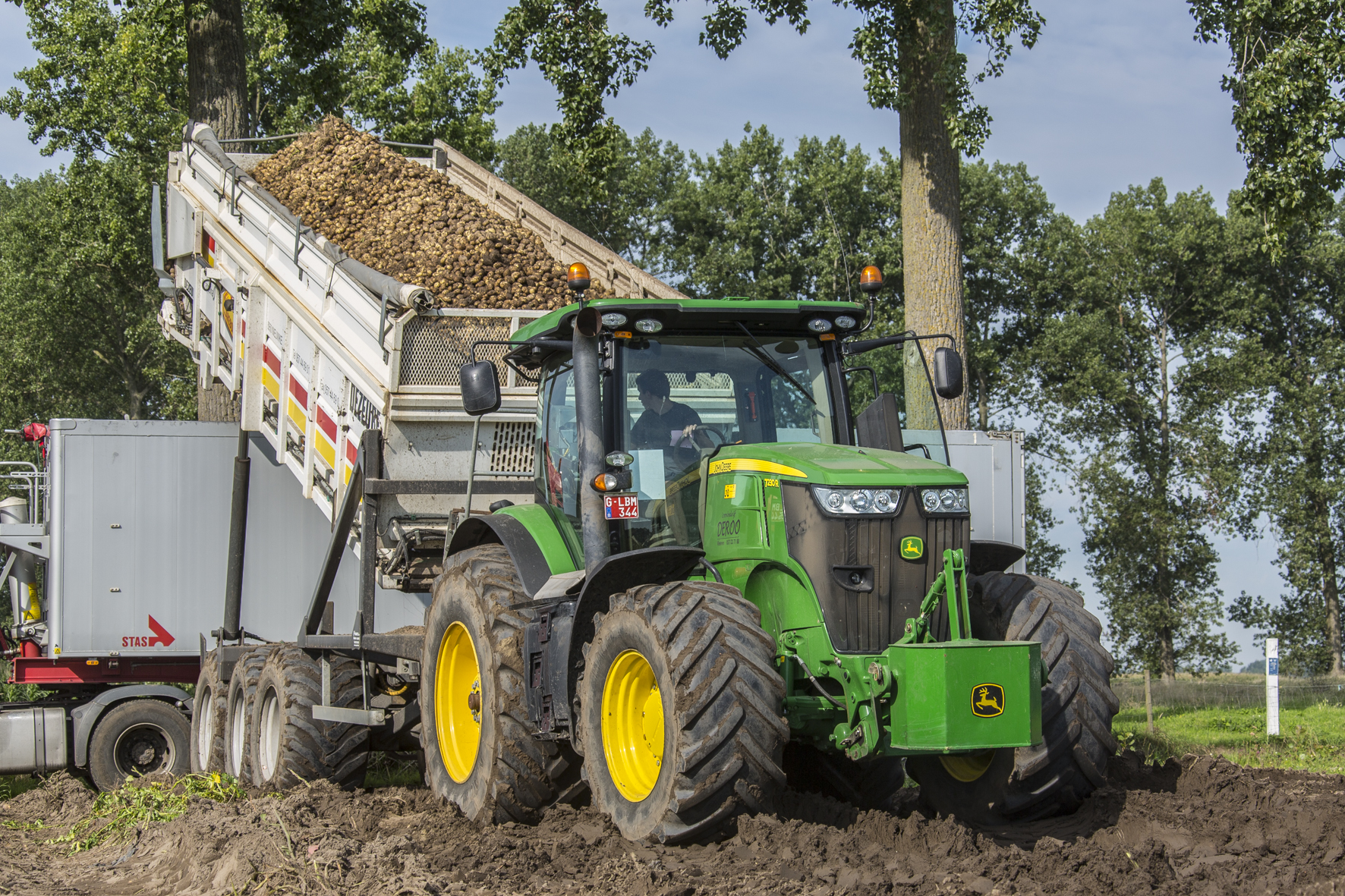 De West-Vlamingen hebben vijftien JD-trekkers in huis die vooral uren maken in het voorjaar. Tractors met 10.000 uren zijn niet versleten, maar eerder achterhaald. De loonwerker heeft vooral nood aan geavanceerde technieken en kopakkermanagement. Trekkers voor de complexere toepassingen worden om de vier of vijf jaar omgeruild. Zo gaan er twee 6.150R en één 6.210R weg en komen er twee 6.155R en één 6.250R in de plaats. Deze laatste komt aan de 6-rijige aardappelplanter op dubbellucht en lagedrukbanden van 2,15 meter hoog. Zo is de bodemdruk lager dan bij een traditionele 4-rijige plantcombinatie. Zwaardere trekkers die dienst doen aan de hooglossers, blijven vaak langer op het bedrijf.