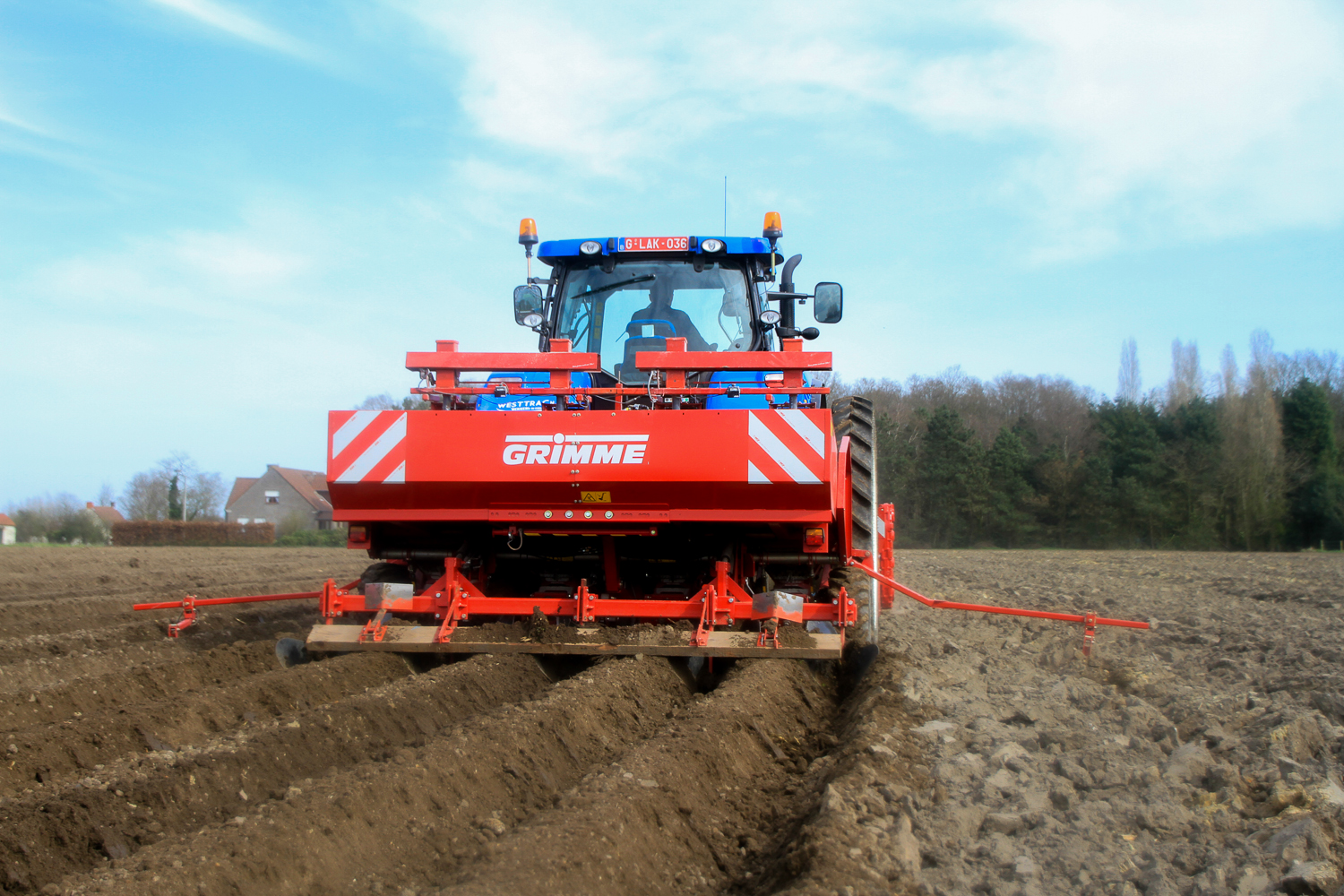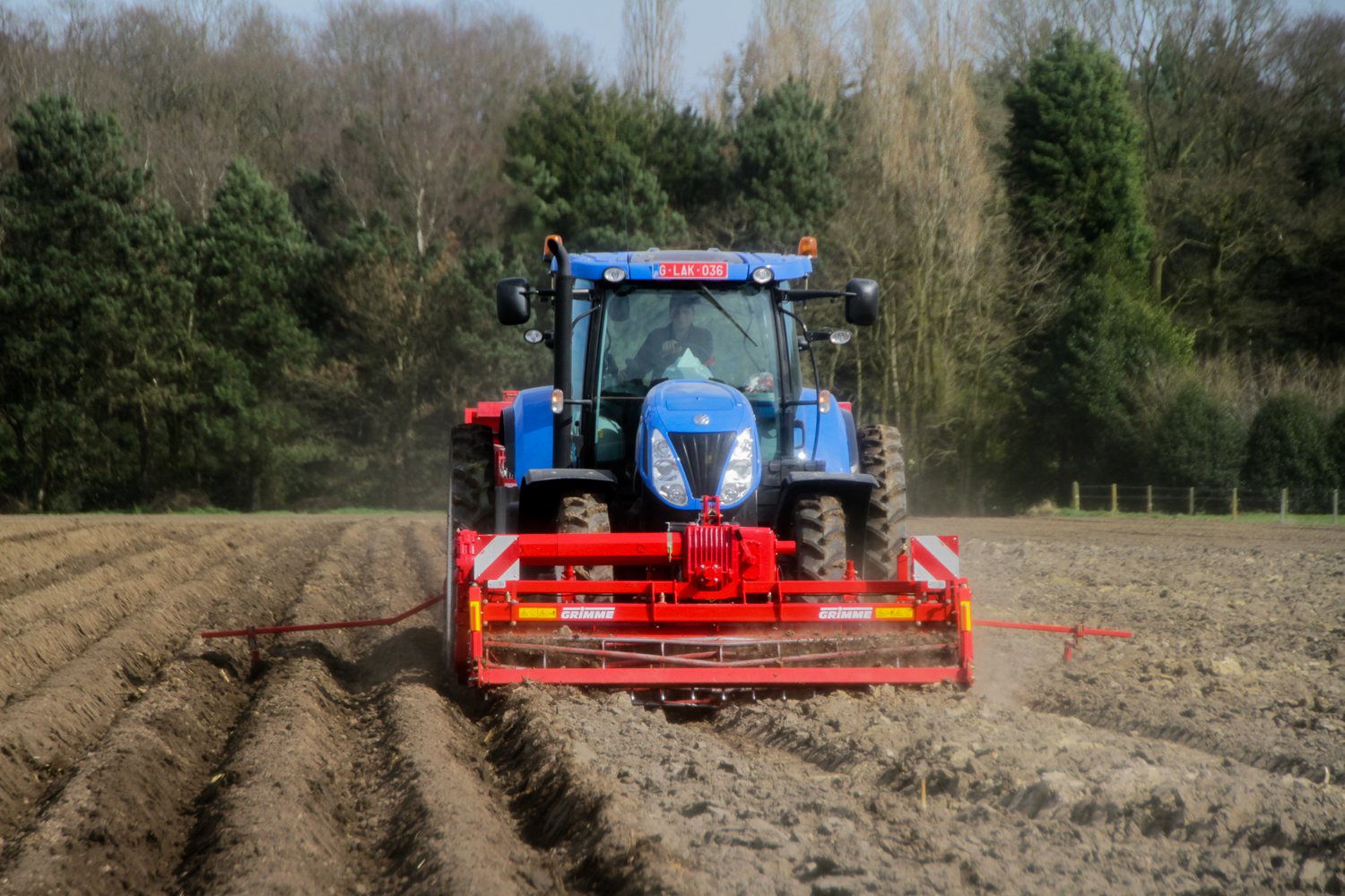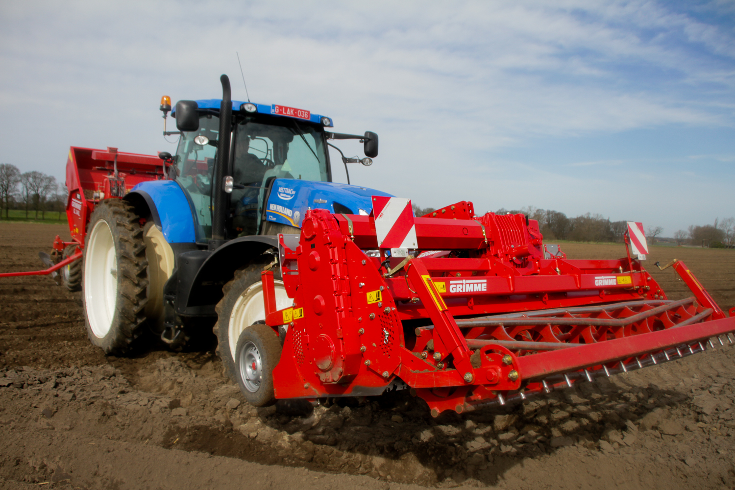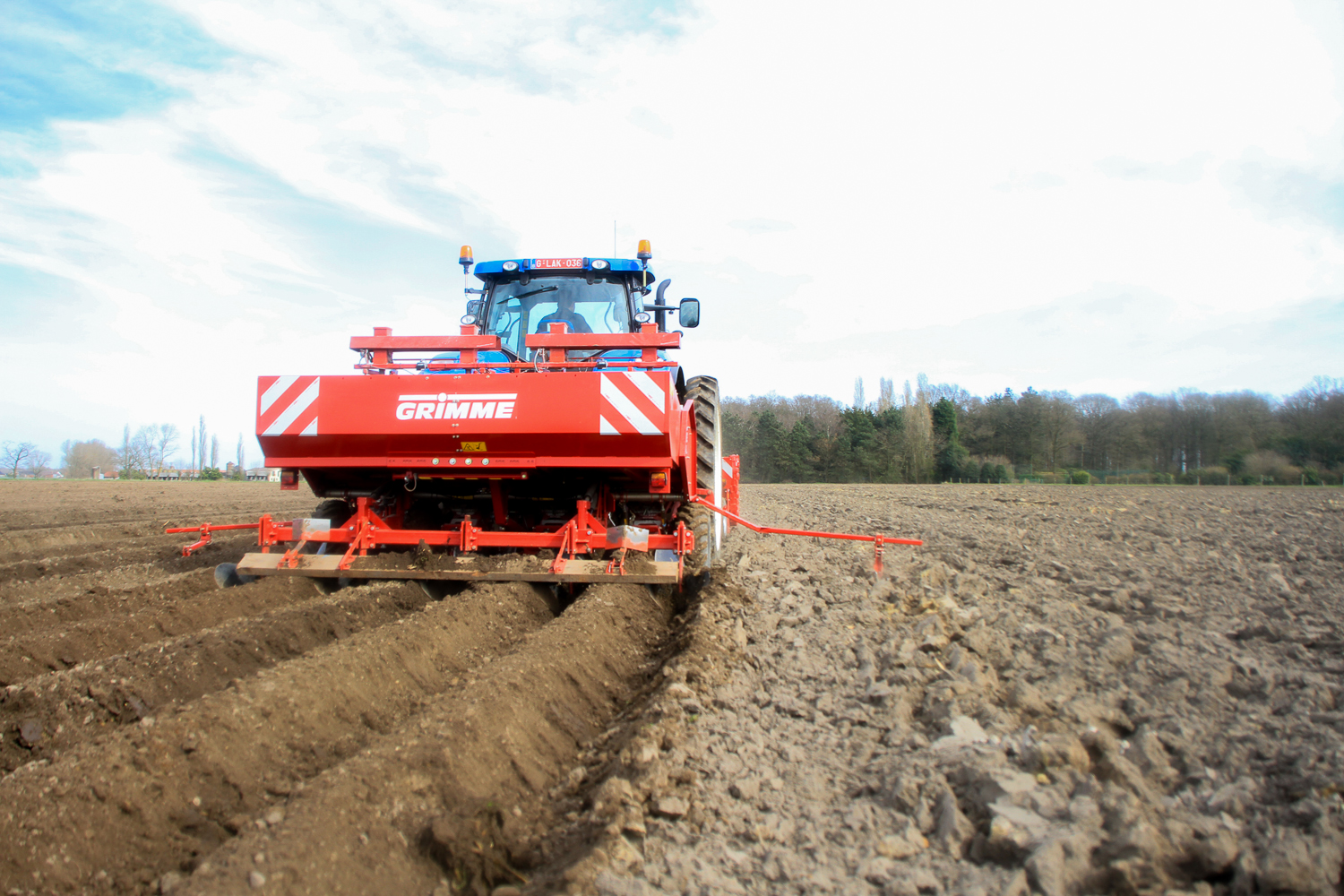 Grimme GR300De Loonwerker zag deze combinatie aan het werk in Aartrijke. De Grimme GR300 was ‘s ochtends door de mecanicien van de firma opgestart en afgesteld. Ondertussen waren de eerste hectares al geplant.   De combinatie bestond verder uit een New Holland T7.220 en een Grimme GL34kl pootmachine.