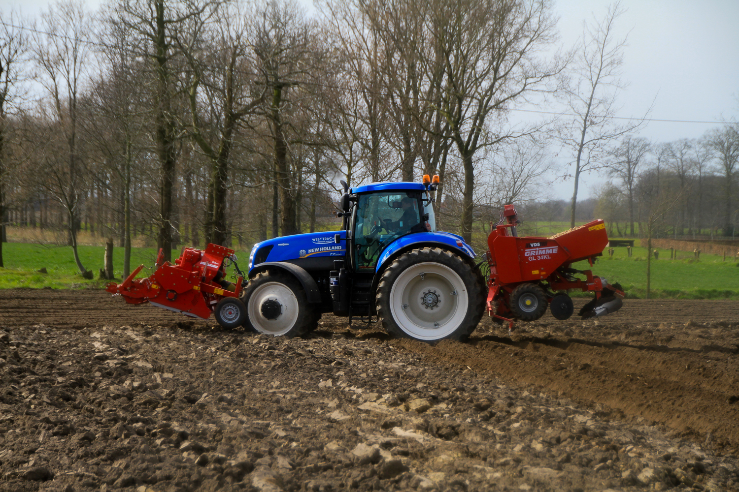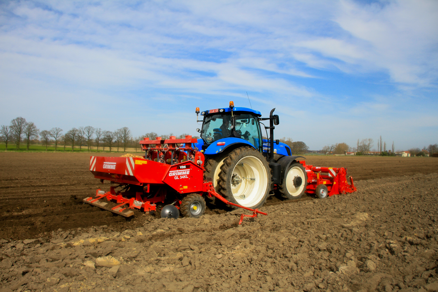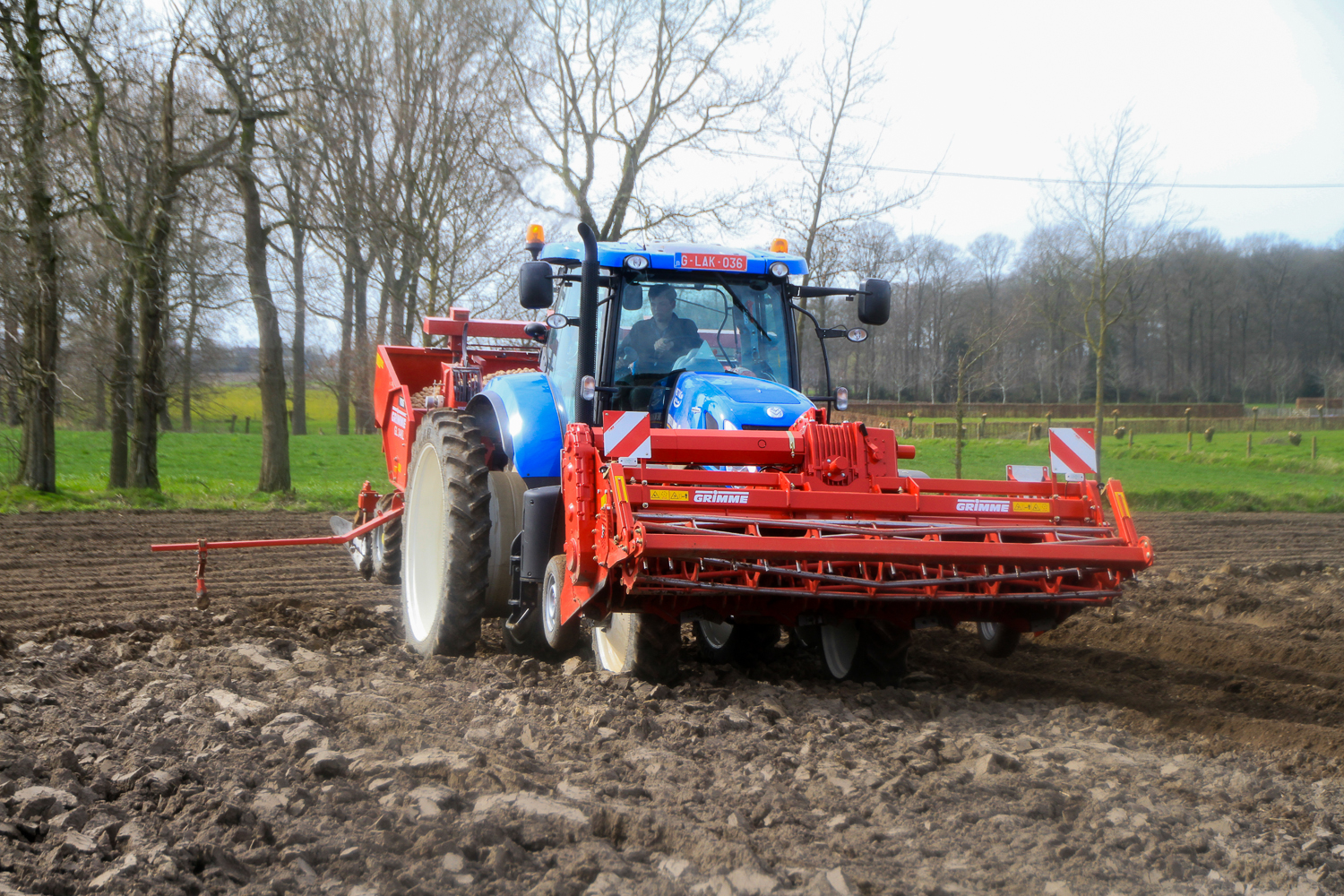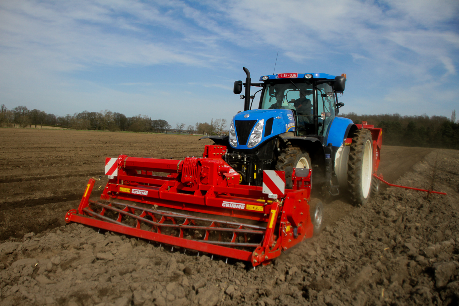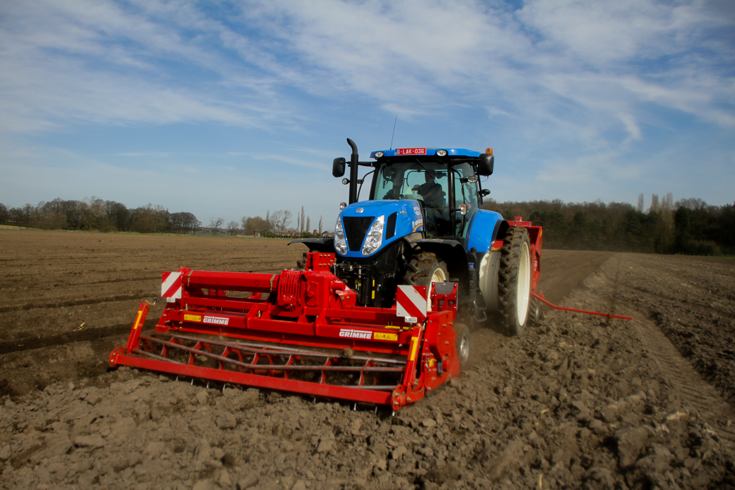 Grimme GR300De Loonwerker zag deze combinatie aan het werk in Aartrijke. De Grimme GR300 was ‘s ochtends door de mecanicien van de firma opgestart en afgesteld. Ondertussen waren de eerste hectares al geplant.   De combinatie bestond verder uit een New Holland T7.220 en een Grimme GL34kl pootmachine.