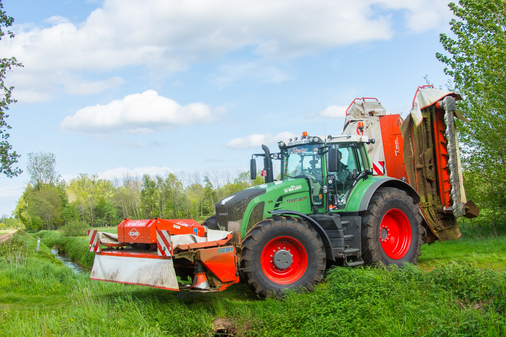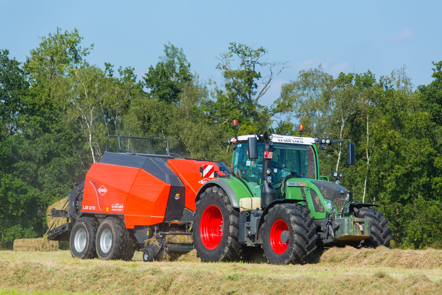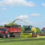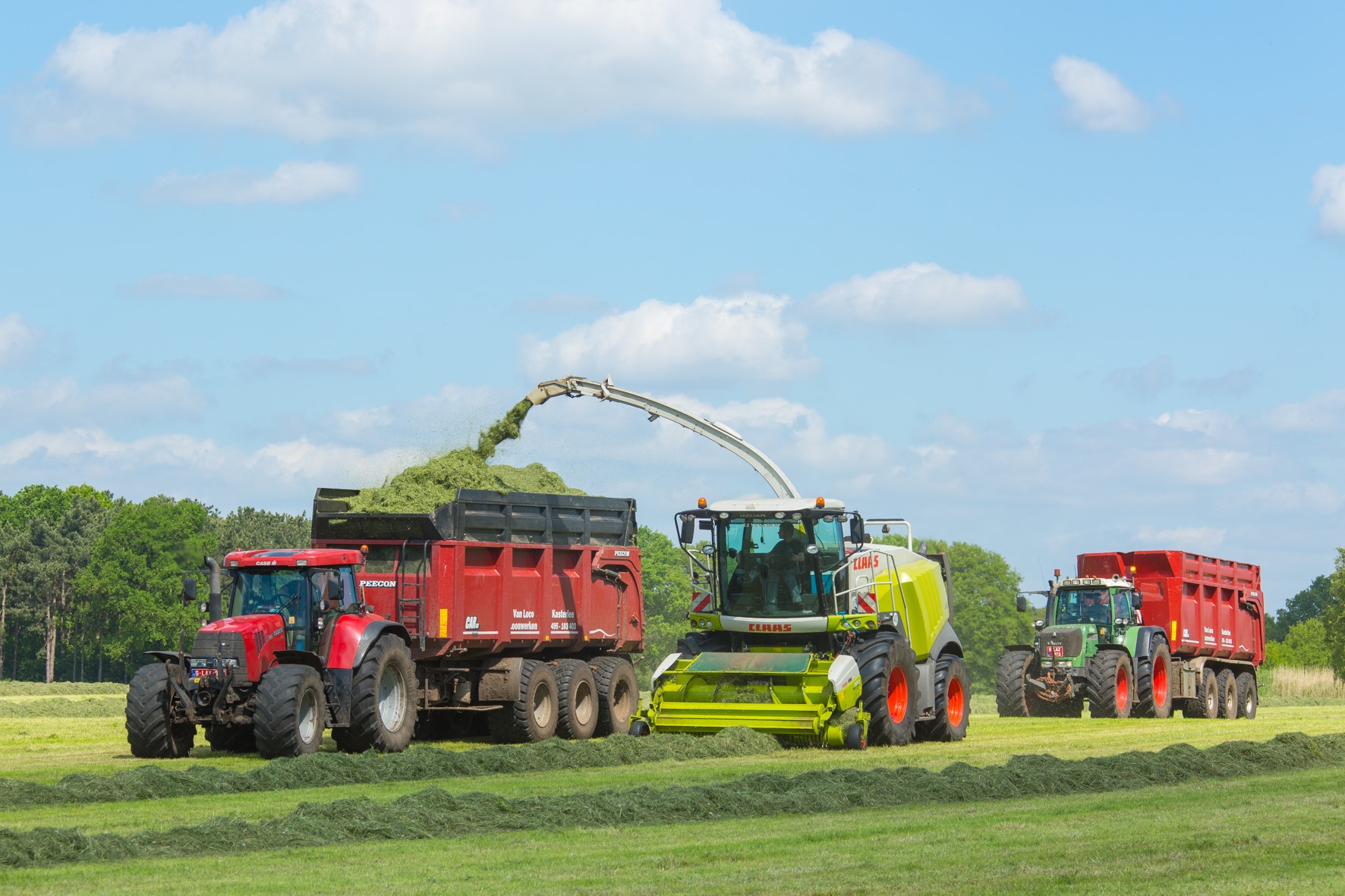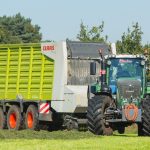 En alsof het niet druk genoeg is moet ook de eerste snede gras de kuil in. Met twee tripplemaaiers hebben ze daar snel wat gemaaid in de Kempen. Ze hebben recentelijk een Kuhn bijgekocht om de Claas bij te springen. Tom en Jo wilden het verschil tussen beide merken meten. Met drie Jaguars 960 hebben de broers capaciteit in huis. “Drie dezelfde hakselaars is makkelijk naar onderhoud en het bestellen van wisselstukken toe. Bovendien is de bediening identiek”, klinkt het logisch. In 2012 had Tom een ongeluk tijdens de oogst en verloor hij zijn rechterhand. Echt tijd om daarover na te denken had hij niet met dank aan voorjaarsdrukte. Tien dagen later zat hij alweer op de maaier. Dankzij hun dealer heeft één van de Jaguars nu een tweede bedieningspaneel aan de linkerkant zodat Tom alsnog kan hakselen. Als de Claas-dubbeldoelwagen niet moet oprapen, gaat hij mee met de hakseltrein. Verder heeft Van Loco twee Kuhn-grootpakpersen die achtervolgd worden door een McHale-wikkelaar. Ook de perswikkelcombinatie is van diezelfde fabrikant.