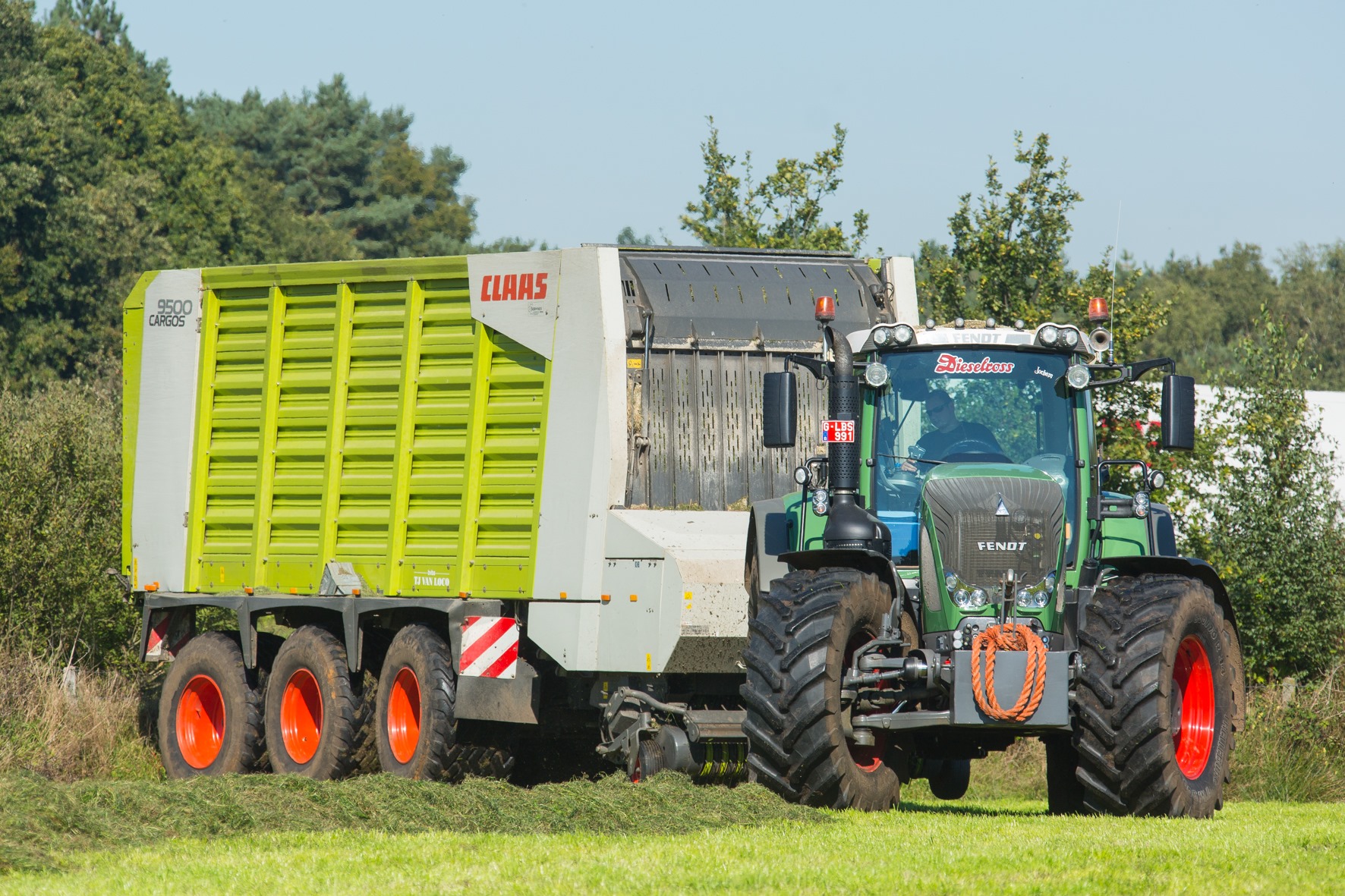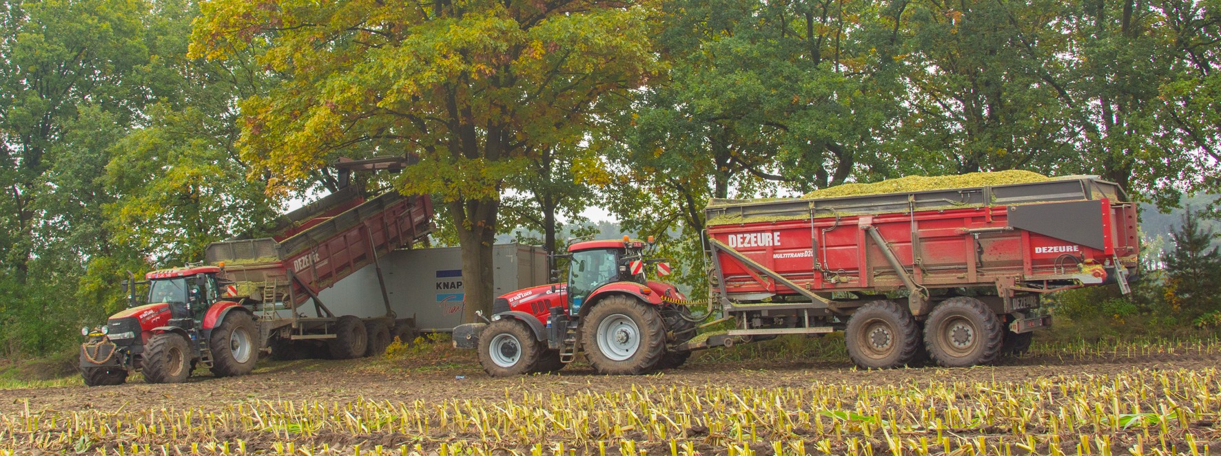 Van Loco zit in een regio waar intensief geboerd wordt. Veel landbouwers moeten het noodgedwongen elders gaan zoeken voor het kweken van ruwvoeder. Regelmatig was de loonwerker met tien wagens maïs onderweg bij één hakselaar. Dat kon efficiënter dachten Tom en Jo. Twee jaar geleden schaften de broers twee Dezeure-hooglossers aan, een 2- en een 3-asser. “Twee 3-assers had makkelijker geweest, dan was de vrachtwagen in twee vrachten vol”, geven ze toe. “Maar de portemonnee zei nee tegen een derde as.” Nu zijn de tien karren vervangen door twee Dezeures en vier walking floor opleggers van 90 m³. Deze derde ploeg hakselt zo’n 60 % op die wijze en dat cijfer vermeerdert elk jaar. De hooglossers zijn uitgerust met tractie waardoor niet met halve vrachten gereden wordt. Ook als de andere karren moeilijkheden hebben, wordt overgeladen. Twee Record-silagewagens hebben die hulp uiteraard niet nodig. De drie kneuzers zijn voorzien van een 8-rijer. Zo zitten ze steeds in het spoor van de planter waardoor ze sowieso verder rijden als het nat is. Het bandendrukwisselsysteem is eveneens een optie waar ze veel plezier aan beleven.