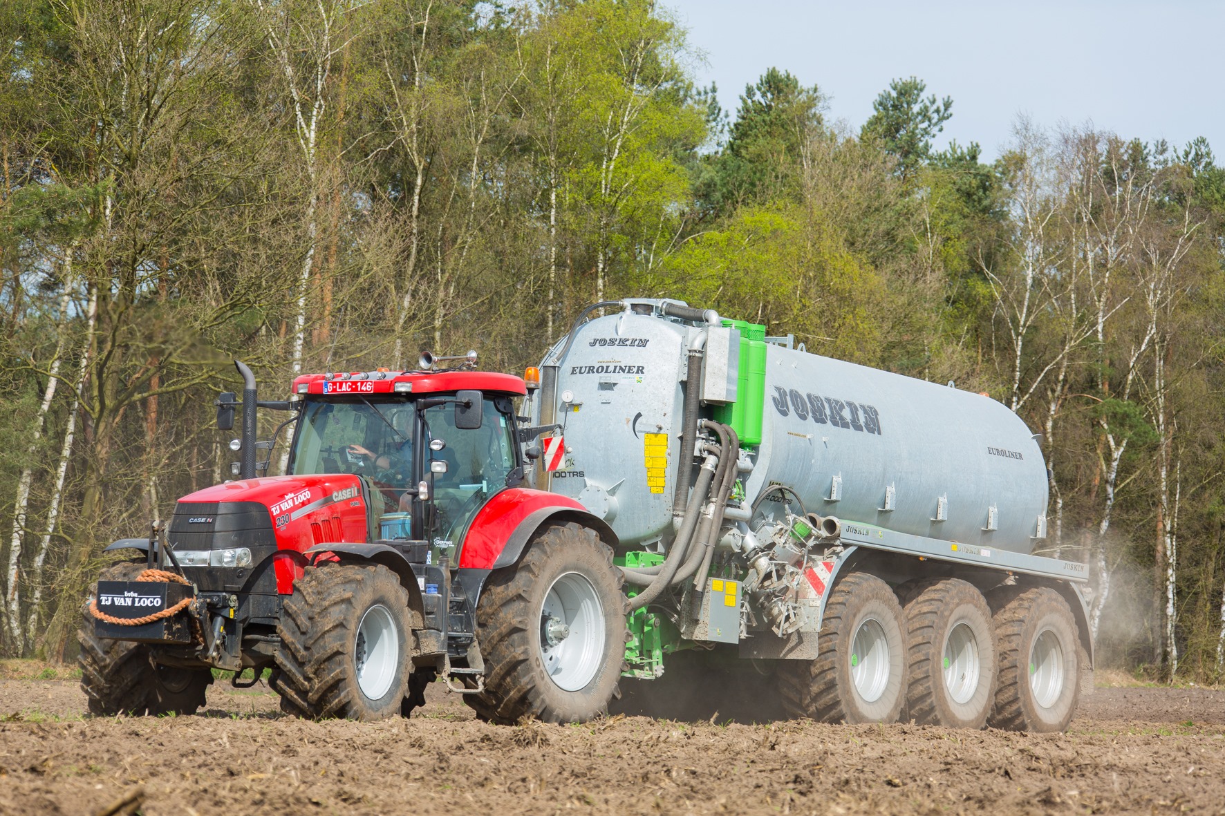 Ondertussen is het mestseizoen gestart. De loonwerker injecteert zowel gras- als bouwland met twee Schuitemakers Robusta van 13 kuub. Beide tonnen zijn voorzien van een uitschuifbare as waardoor de bodemdruk beperkt is. Net zoals over het werkbeeld zijn Tom en Jo ook tevreden over de capaciteit. Op het gras gaan ze te werk met 8,7 meter brede Schuitemaker-injecteurs, op akkerland zijn dat Joskins van 5,4 meter. Zolang deze tanks niet versleten zijn wordt niet gedacht aan een zelfrijder.
