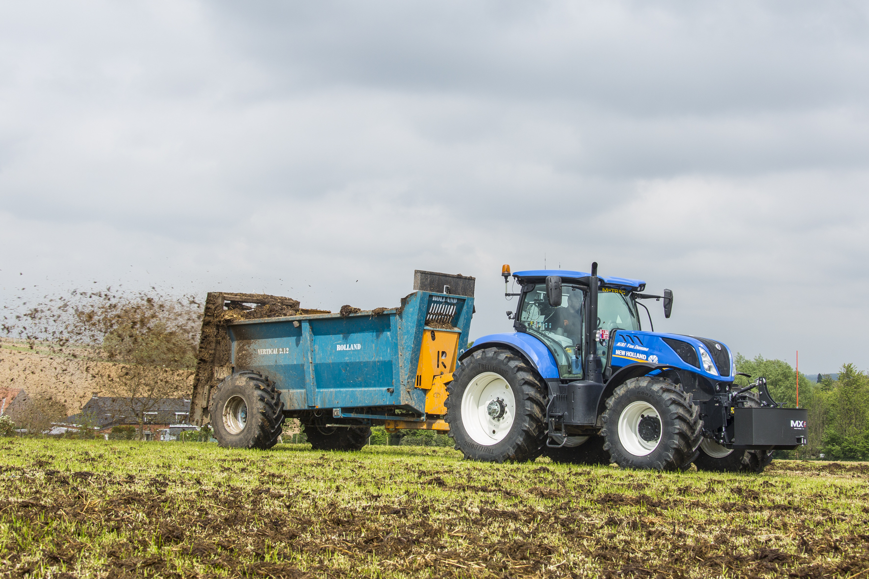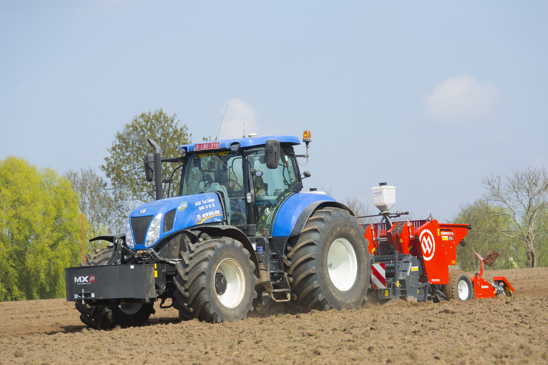 Voordat er gezaaid wordt, moet er eerst gemest worden met een Rolland-breedstrooier. Als het echt druk is, schakelt Van Damme zijn schoonouders in met een tweede wagen. Omdat het landschap glooiend is, worden niet alle akkers geploegd. De loonwerker heeft een Beckman-schijveneg van 5,5 meter met een rendement van drie hectare per uur, de NH T7.260 heeft er zijn werk aan en de gewone cultivator komt amper buiten. Omdat er vaak gewasresten achterblijven, zijn alle zaaimachines uitgerust met schijfkouters om mooi werk te leveren. De nieuwste is een Kuhn-combinatie voor gras en graan met diepgronder en rotoreg, de speciaalste is een 7-rijige maïsplanter ook van diezelfde fabrikant. “Dit model is inschuifbaar tot een transportbreedte van drie meter. De trekker staat iets breder zodat er drie rijen binnen het zaaispoor vallen. Bieten zaaien ze op dubbellucht. De periode dat het zaaien van maïs en bieten planten overlapt, wisselen ze de banden om. Voor het poten van de aardappelen sturen ze drie Miedema’s uit. Om te zien hoe ver de boeren opgeschoten zijn met de voorjaarswerken, kijken ze aandachtig naar de Ronde van Vlaanderen die hun streek kruist.