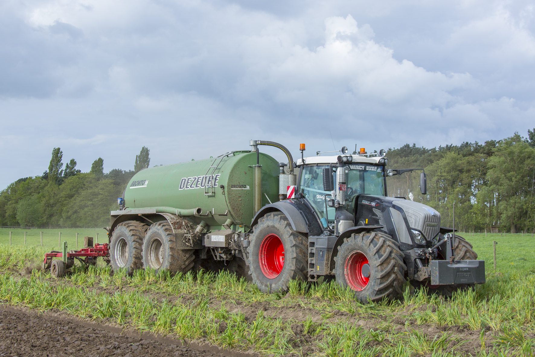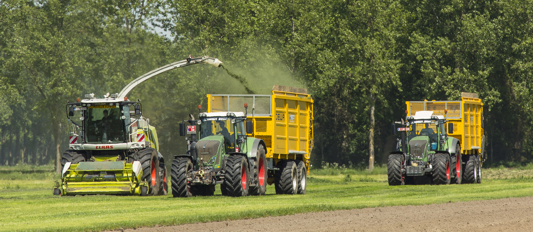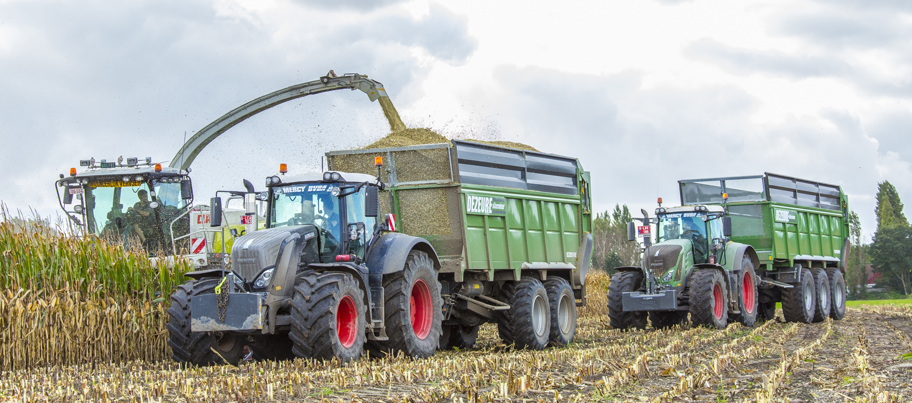 In Sint-Laureins zijn ze blijven investeren in landbouw, weliswaar matiger dan in de transporttak. De mestwagen was zijn eerste aankoop, voor het injecteren leende hij de Dezwaef van zijn vader. Ondertussen heeft hij een Dezeure Bronto voor het bemesten van gras- en bouwland. Met een 3-asser van Dezwaef en Dezeure voeren ze aan en spreiden ze open. Ondertussen vervolledigde een Amazone maisplanter en Pöttinger-dubbeldoelwagen het lijstje. Het enige wat daarop ontbrak was hakselen. “Een bewuste keuze. Omdat we zwaar geïnvesteerd hadden in transport, wilde ik die activiteiten niet verwaarlozen.” Een telefoontje van een collega-loonwerker die zich in het mestgebeuren wou specialiseren en het kneuzen wilde afstoten, deed hem twijfelen. Het waren zijn pa en meestergast die hem uiteindelijk over de streep trokken. Frederik nam begin 2017 een Claas Jaguar 960 over samen met een stel rupsen en twee silagewagens van Dewa en Record. Die laatste twee ruilde hij meteen in voor twee grote Dezeures.