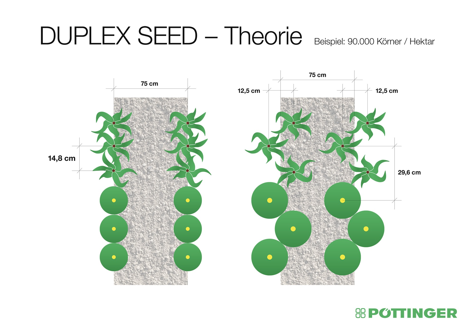 Pöttinger introduceerde eerder al de Aerosem PCS combinatiezaaimachines die zowel voor het zaaien van granen en grassen als voor het zaaien van maïs ingezet kunnen worden. Met Duplex Seed kunnen de machines nu ook maïs in dubbele rij zaaien. Na tests van de Universiteit voor Bodemwetenschappen in Wenen bleek dat deze zaaimethode goed is voor tot 11% meeropbrengst bij kuilmaïs en tot 8% meeropbrengst bij korrelmaïs.