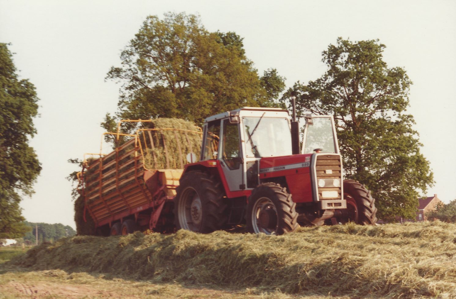 De Massey Ferguson 698 met een tandem Mipa-opraapwagen.