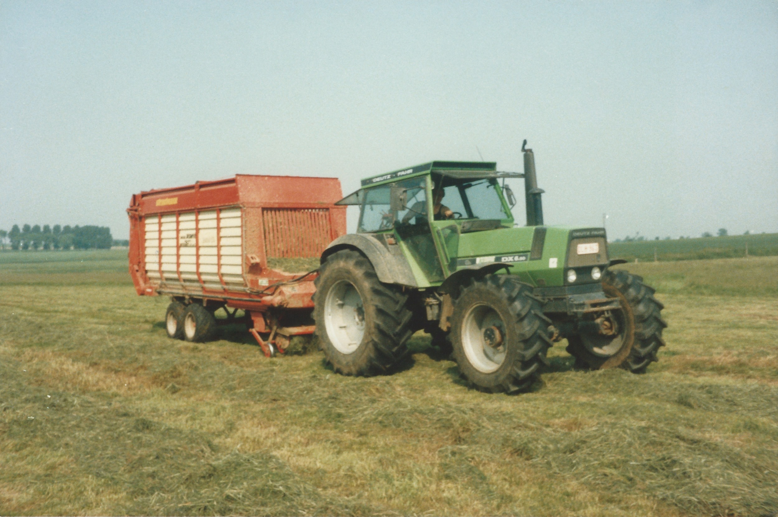 Gras oprapen einde jaren 80 met een Deutz DX 6.50 en een Strautmann opraapwagen.