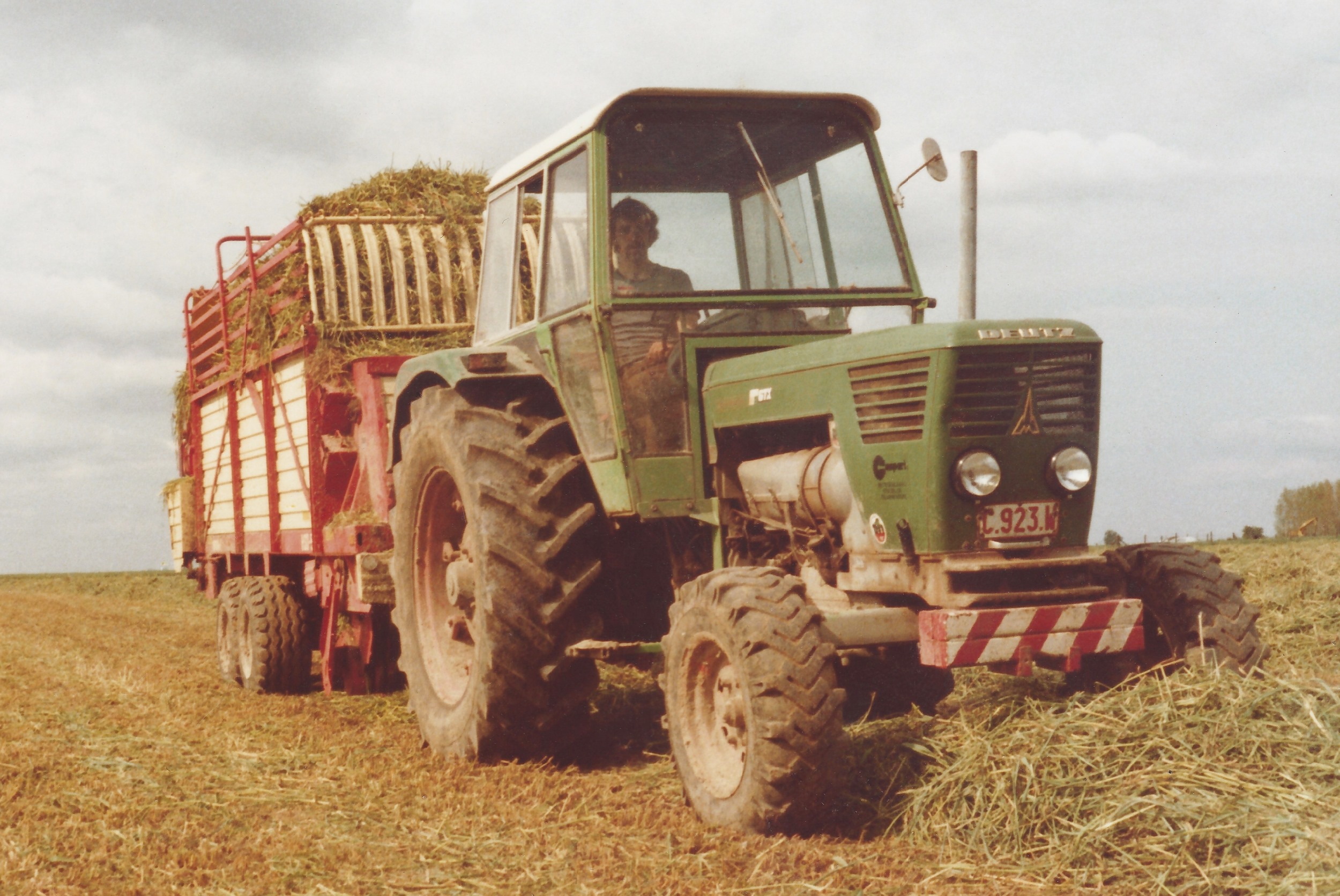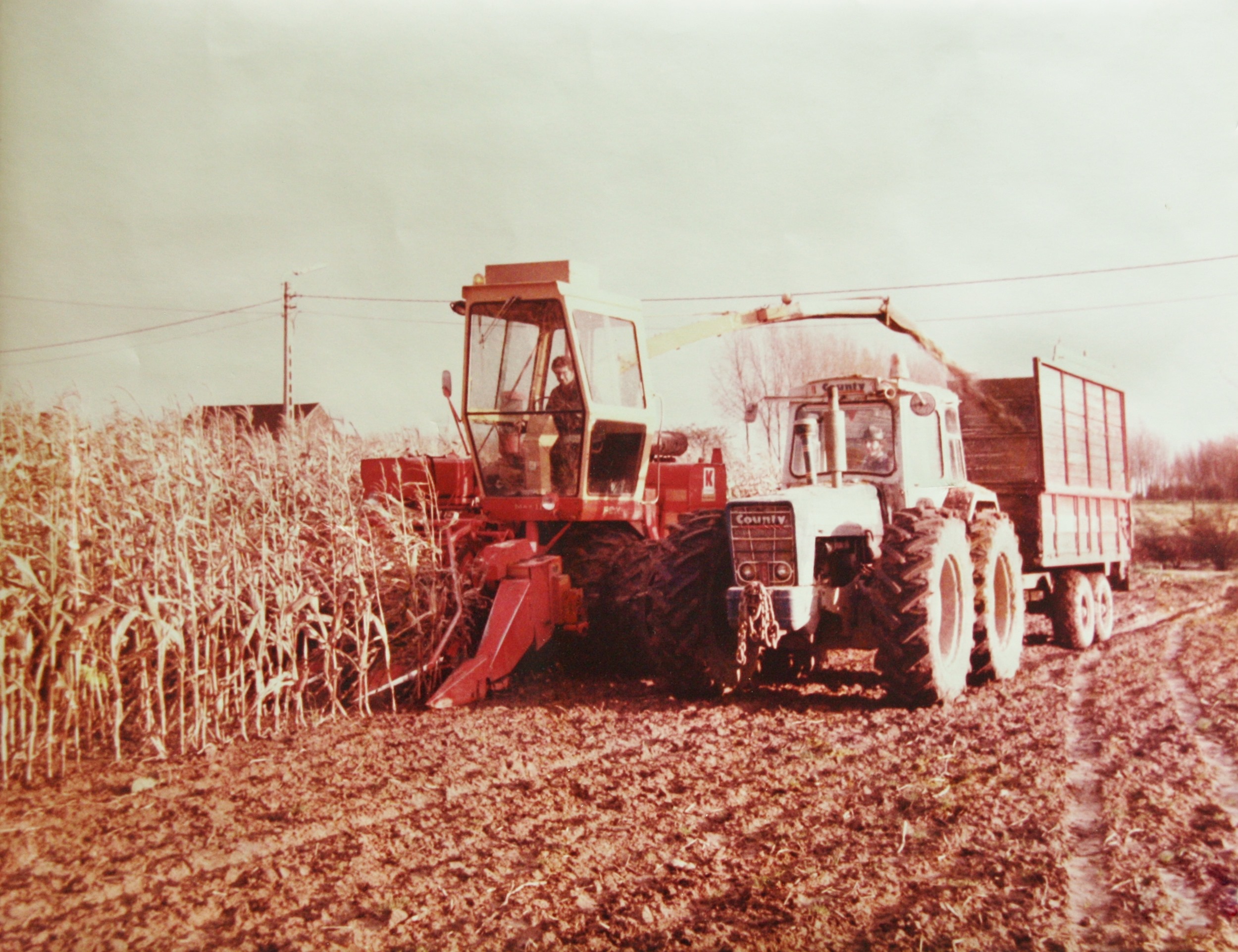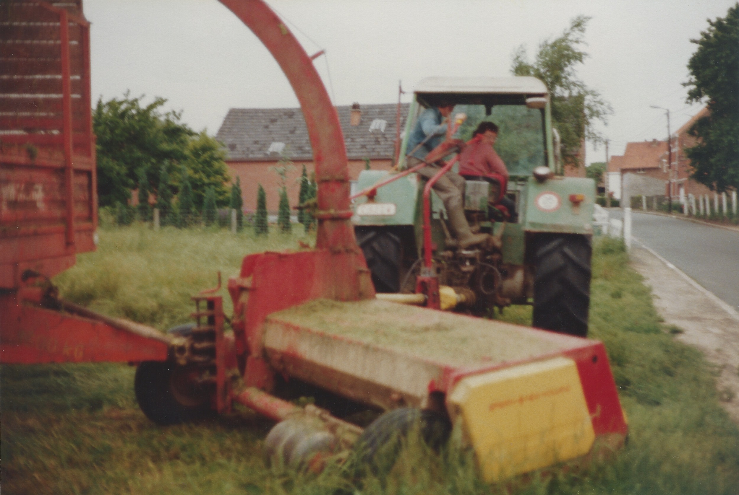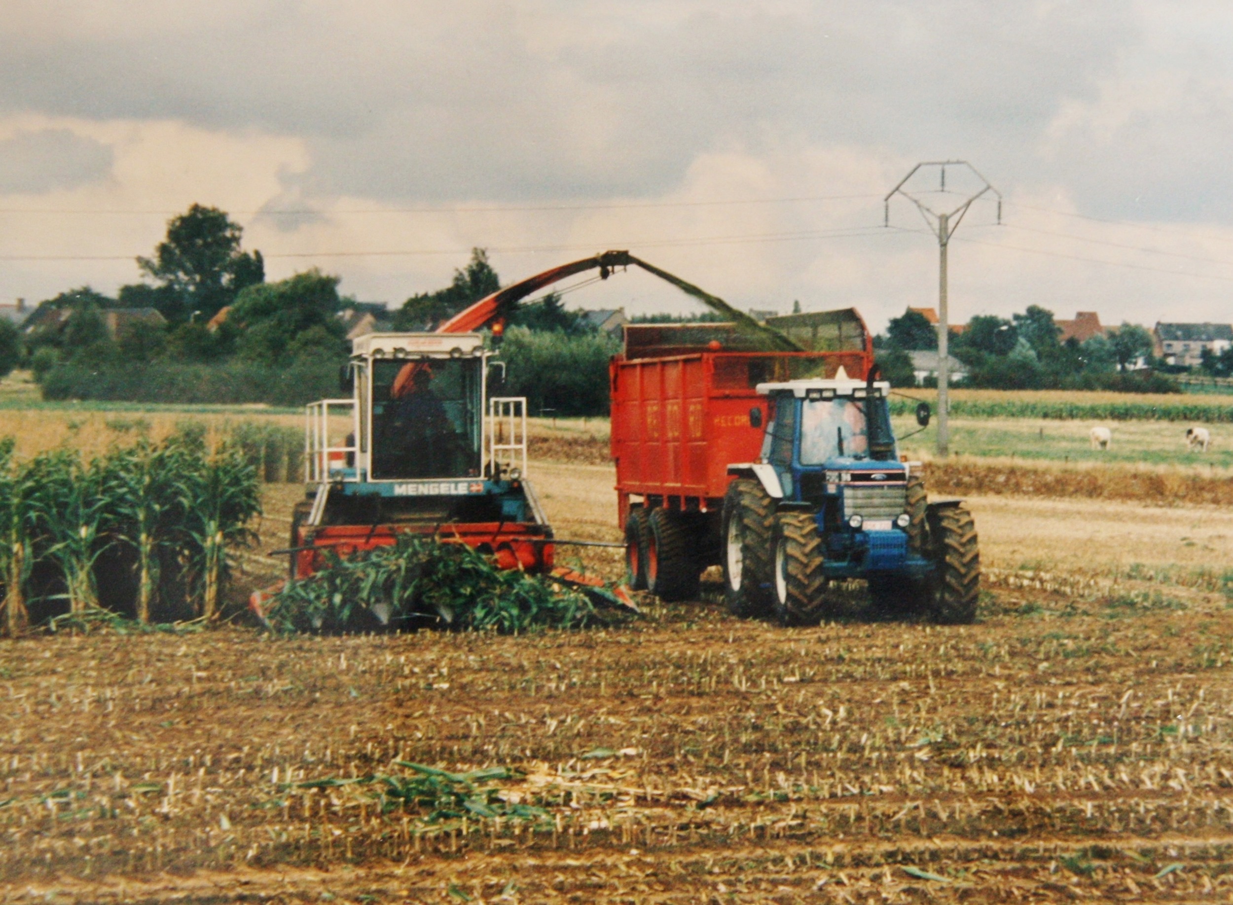 Het is dan ook een bedrijf met een mooie geschiedenis. Met een eerste aangekochte trekker, een Hanomag trok Julien erop uit om allerhande kleinere werken uit te voeren. Ook graan gaan afrijden met de pikbinder deed hij. De eerste maïs reed hij ook af met deze pikbinder. Na het afrijden werden de maïsplanten opgeladen om ze vervolgens op de hoeve door een stationaire hakselaar te laten verhakselen. In 1972 kwam dan een eerste echte maïshakselaar op het bedrijf, een getrokken 2-rijïge Rivierre Casalis. Niet veel later volgde al een zelfrijder in de vorm van een Laverda TA 150.